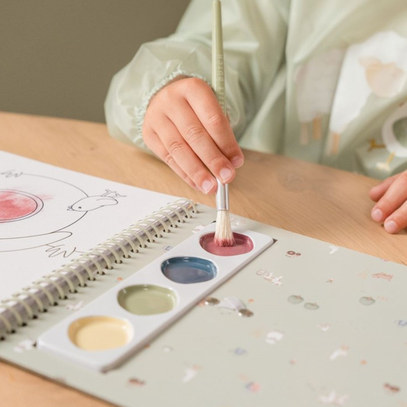 Libro para colorear con acuarelas de la temática pequeña granja. Contiene 30 páginas con diferentes diseños para colorear, 4 colores de acuarela y un pincel.