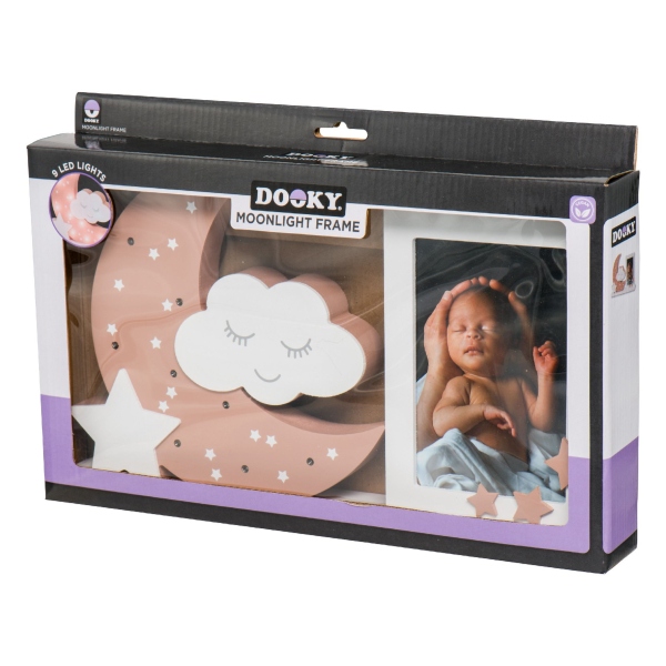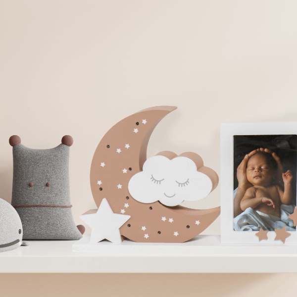 Precioso marco de fotos ideal para hacer un regalo. Está compuesto por una luna, una nube con carita y una estrella. La luna contiene 9 pequeñas luces LED que iluminarán el espacio aportando calidez. Es perfecto para decorar cualquier estancia de una habitación.