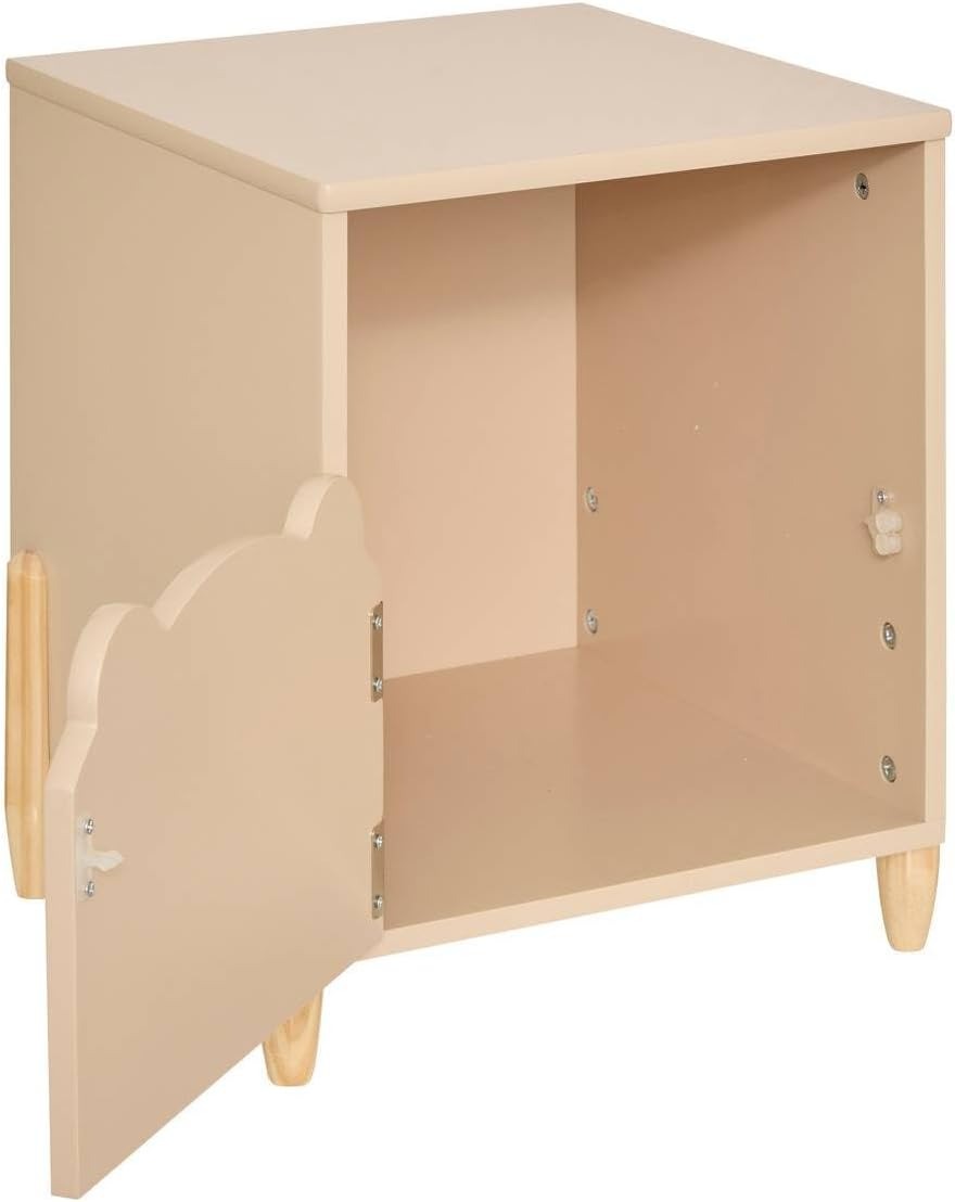Cuenta con estructura robusta y patas de madera de pino natural, ideales para brindar estabilidad y resistencia. Incorpora una puerta con corte decorativo que facilita el acceso y organización de libros, juguetes o pequeños objetos.