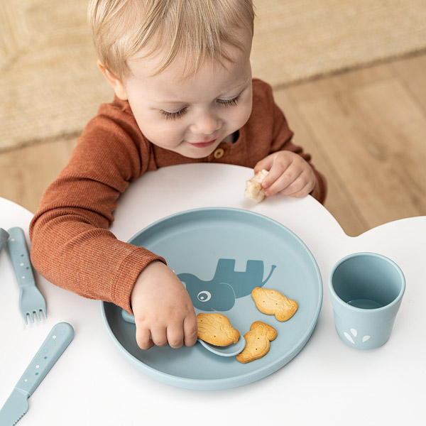 Vaso mini en color azul, con un divertido diseño del elefante Elphee buscando agua para poder salpicar. Por su tamaño es perfecto para los más peques de la casa.