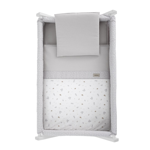 - Incluye: almohada, colchón y somier de madera de 5mm, soporte de madera lacada en blanco y su vestidura cosida que incluye colcha de minicuna con relleno extraíble.