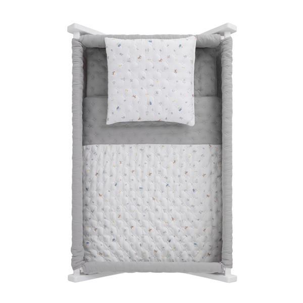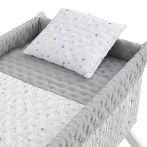 - Incluye: almohada, colchón y somier de madera de 5mm, soporte de madera lacada en blanco y su vestidura cosida que incluye colcha de minicuna con relleno extraíble.
