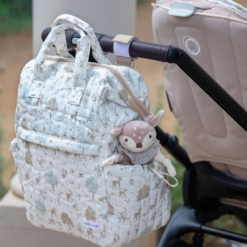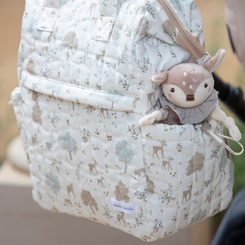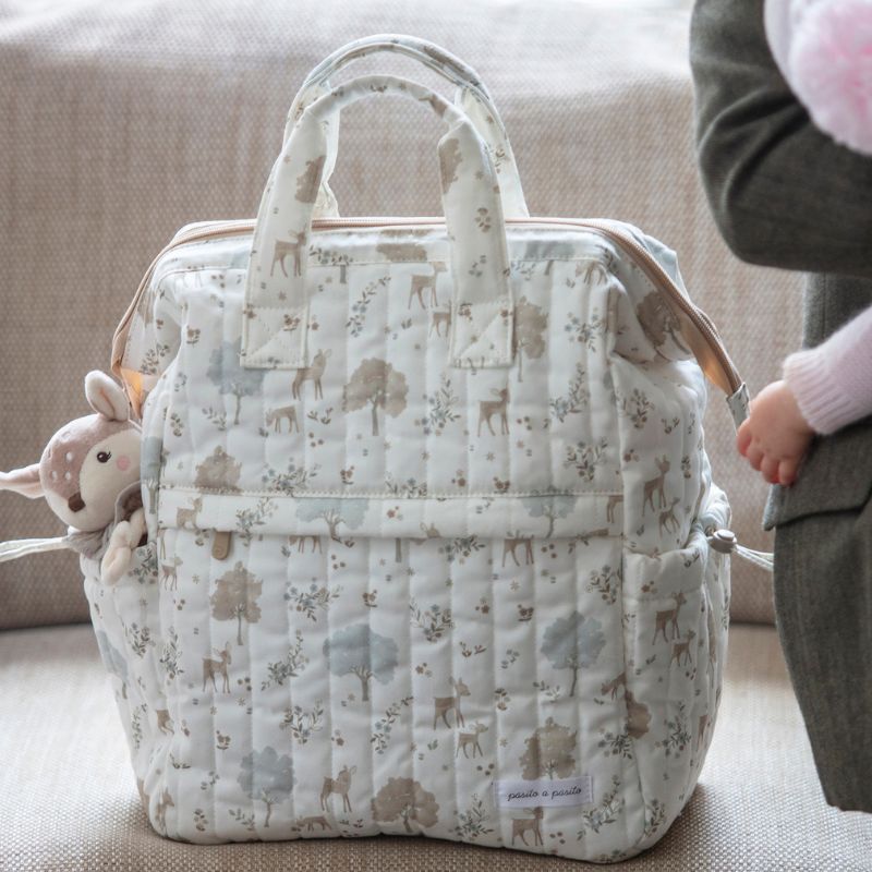 La mochila maternal Nara de Pasito a Pasito está confeccionada en loneta de algodón 100% con un delicado estampado de ciervos y árboles en tonos neutros.