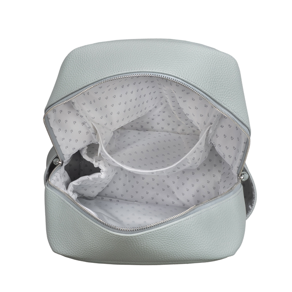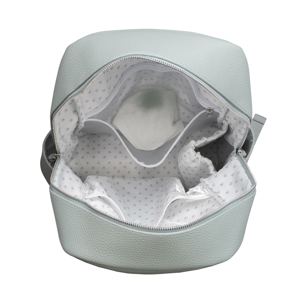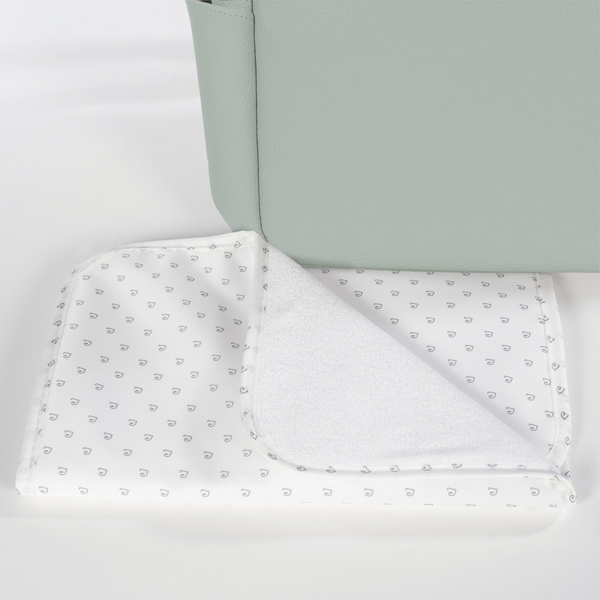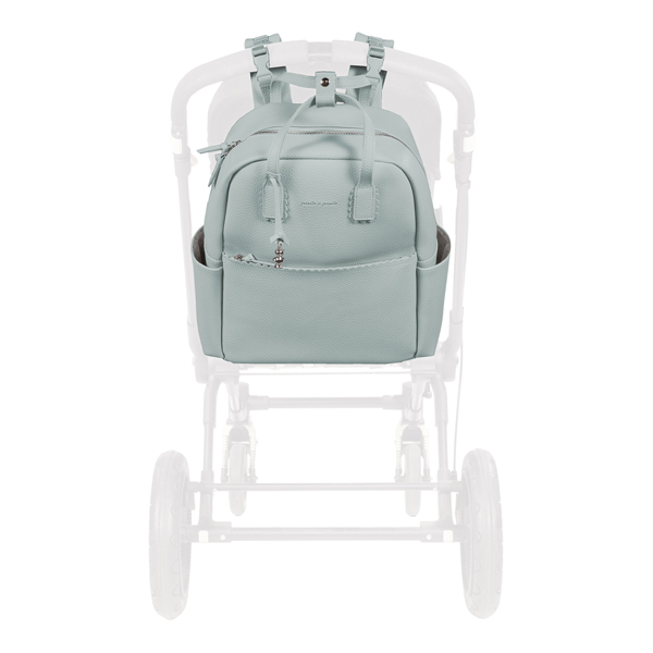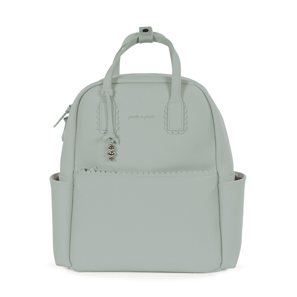 Mochila maternal confeccionada en polipiel en color verde. Su gran capacidad te permitirá guardar todo lo necesario para ti y tu bebé. Cuenta con  bolsillos interiores y exteriores para tenerlo todo a mano y bien organizado. Dispone de un bolsillo interior térmico para llevar biberones, un bolsillo plastificado para guardar alguna prenda de ropa que esté húmeda o mojada, y un bolsillo para guardar el cambiador. Además de dos bolsillos laterales y una cinta trasera para sujetarla a la maleta trolley.