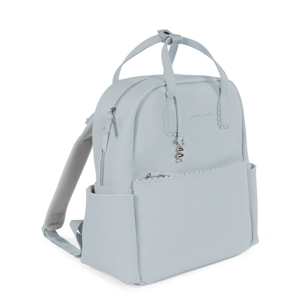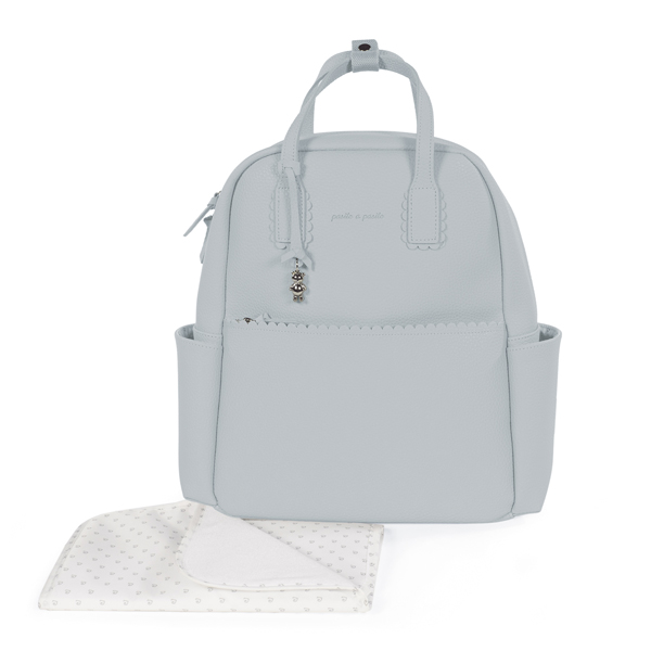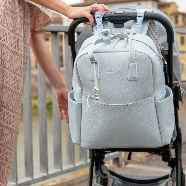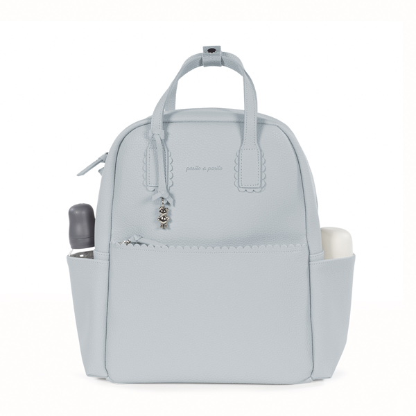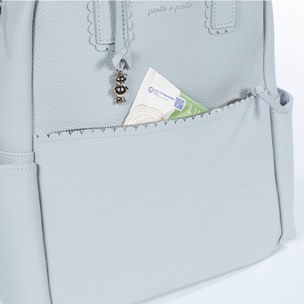 Mochila maternal confeccionada en polipiel en color celeste. Su gran capacidad te permitirá guardar todo lo necesario para ti y tu bebé. Cuenta con bolsillos interiores y exteriores para tenerlo todo a mano y bien organizado. Dispone de un bolsillo interior térmico para llevar biberones, un bolsillo plastificado para guardar alguna prenda de ropa que esté húmeda o mojada, y un bolsillo para guardar el cambiador. Además de dos bolsillos laterales y una cinta trasera para sujetarla a la maleta trolley.