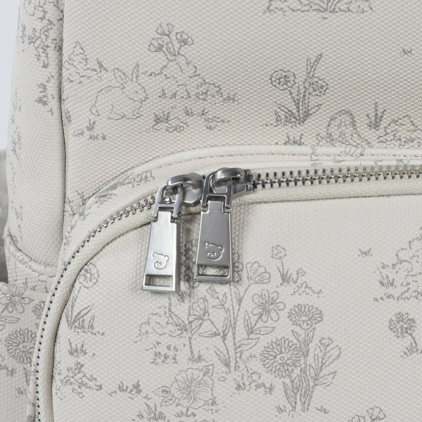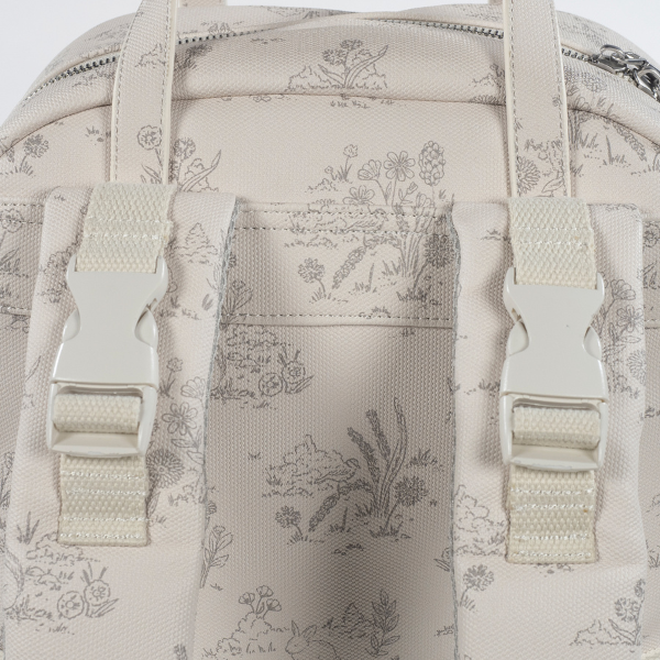 Mochila maternal confeccionada en polipiel con estampado floral en tono crema. Su gran capacidad te permitirá guardar todo lo necesario para ti y tu bebé. Cuenta con bolsillos interiores y exteriores para tenerlo todo a mano y bien organizado. Dispone de un bolsillo interior térmico para llevar biberones y un bolsillo plastificado para guardar alguna prenda de ropa que esté húmeda o mojada. Además, tiene un compartimento donde podrás guardar un portátil o tablet. Y una cinta trasera para sujetarla a la maleta trolley.