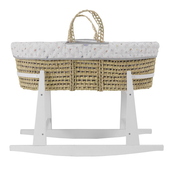- Incluye: capazo de mimbre, colchón, colcha, cojín de 30x30cm. vestidura y portamoisés balancín en color blanco de madera.