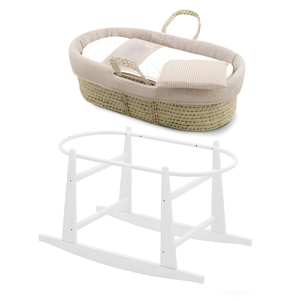 • Incluye: capazo de mimbre, colchón, colcha, cojín de 30x30cm. vestidura y portamoisés balancín en color blanco de madera.
