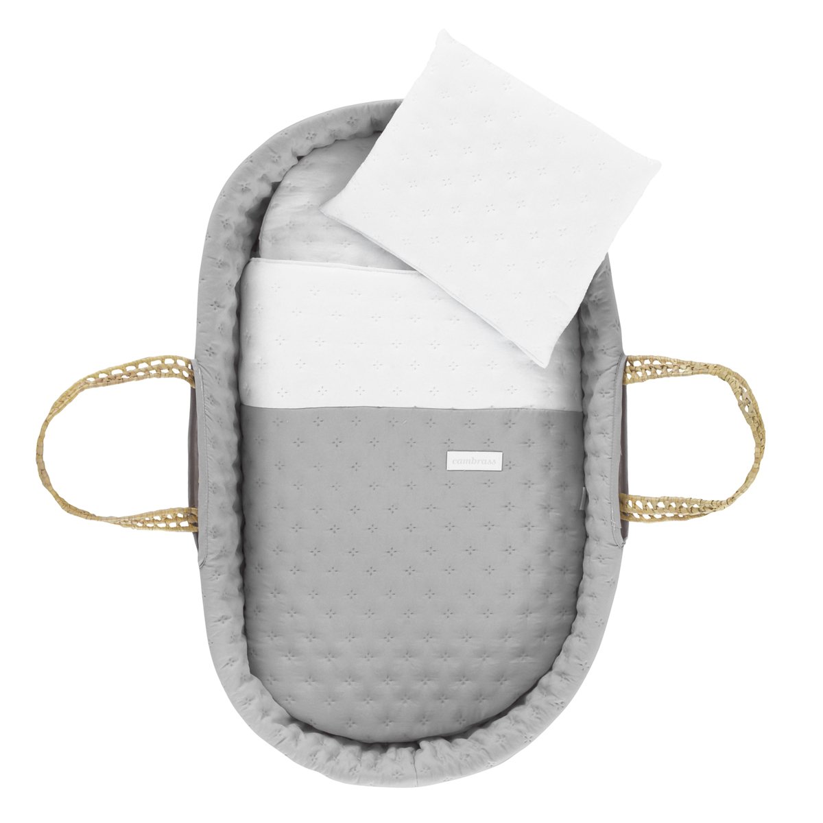 • Incluye: capazo de mimbre, colchón, colcha, cojín de 30x30cm y vestidura.