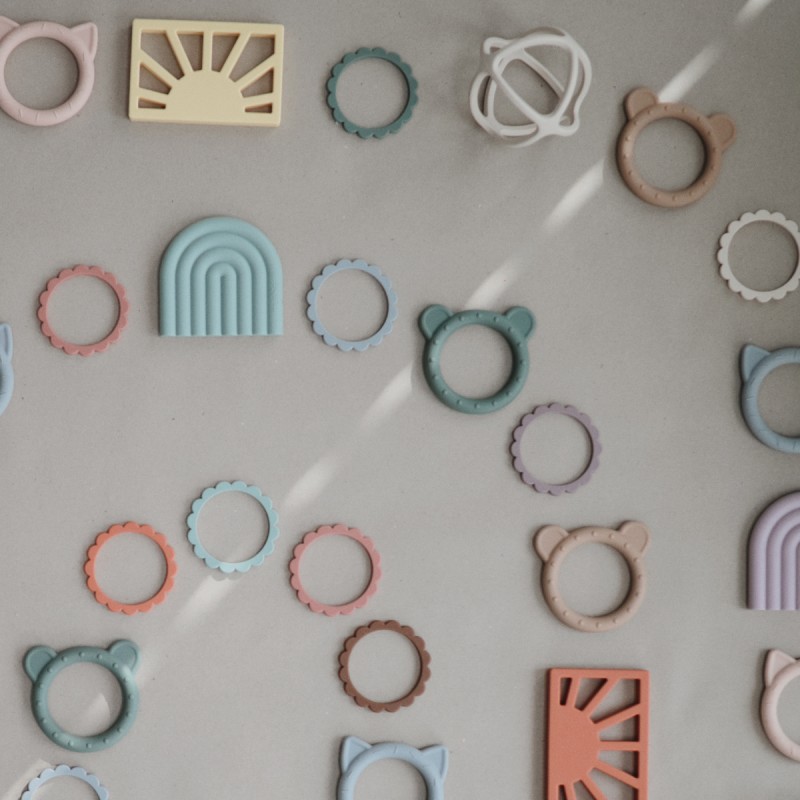 La línea de mordedores está hecha de silicona de calidad alimentaria y está diseñada para que las manitas de los bebés las agarren fácilmente.