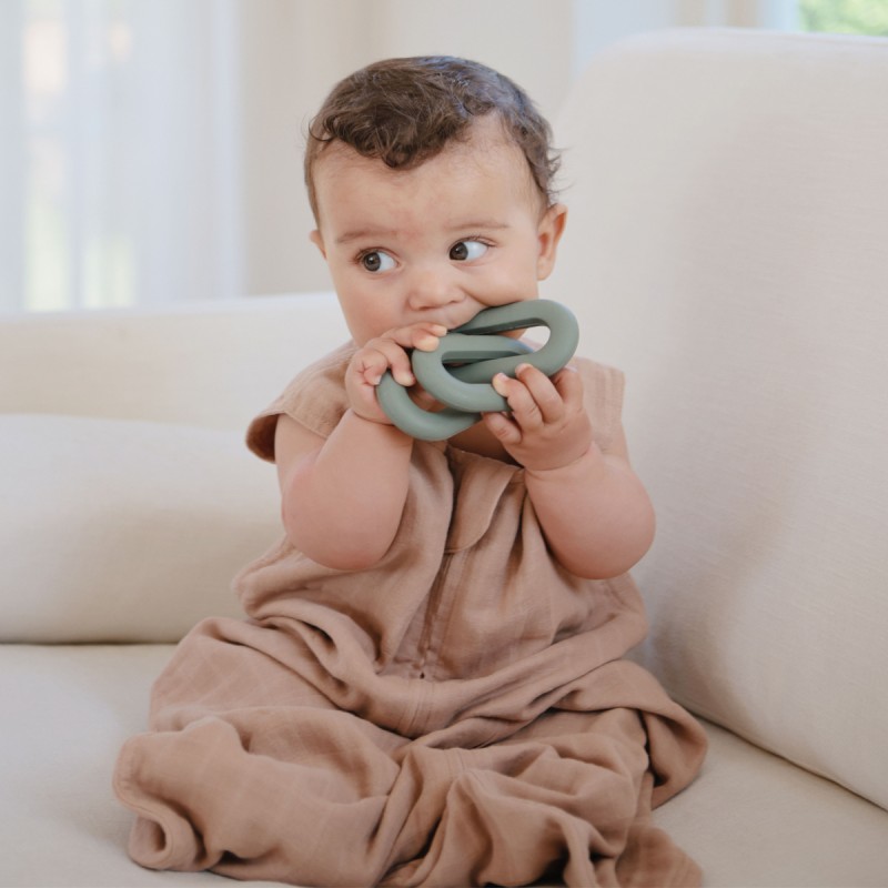 Este mordedor único con tres eslabones ofrece experiencias sensoriales a los niños y alivia eficazmente las encías doloridas.