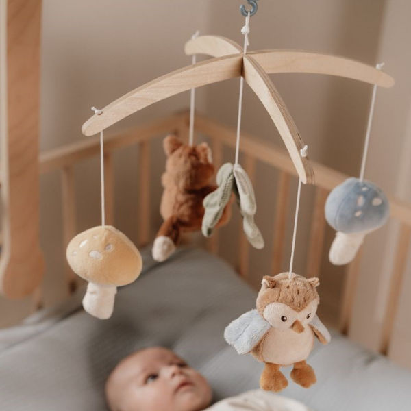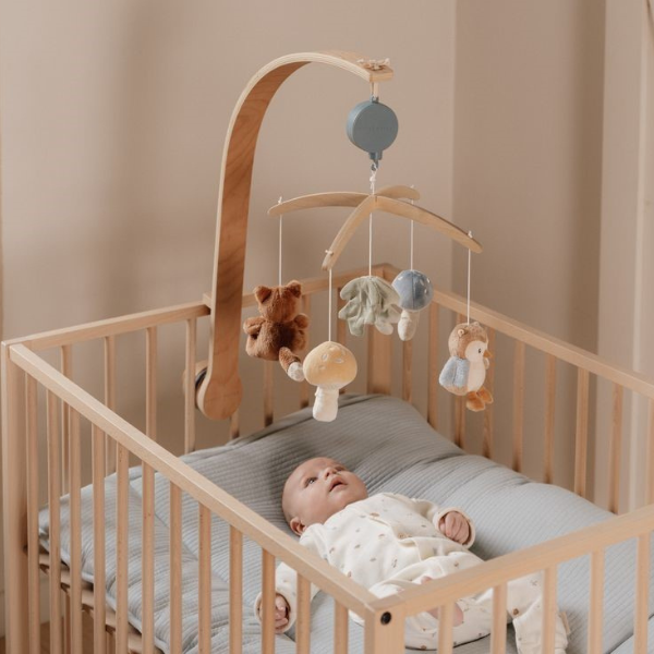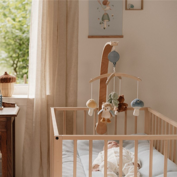 Crea un ambiente cálido y relajante en la cuna de tu bebé con el Móvil Musical de Madera – Forest Friends.