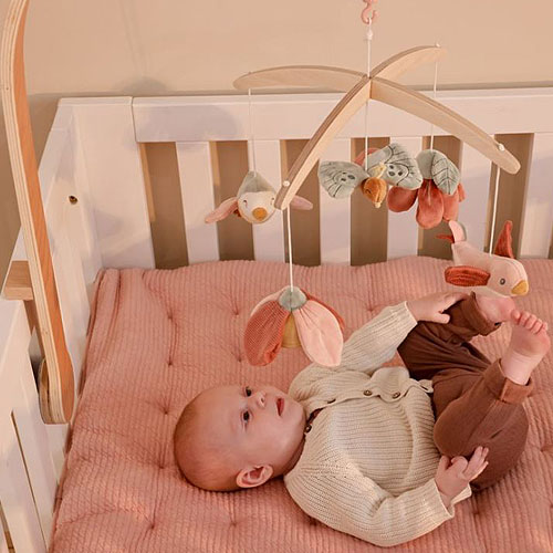 El móvil es adecuado desde el nacimiento y se puede conectar fácilmente a una cuna o parque.