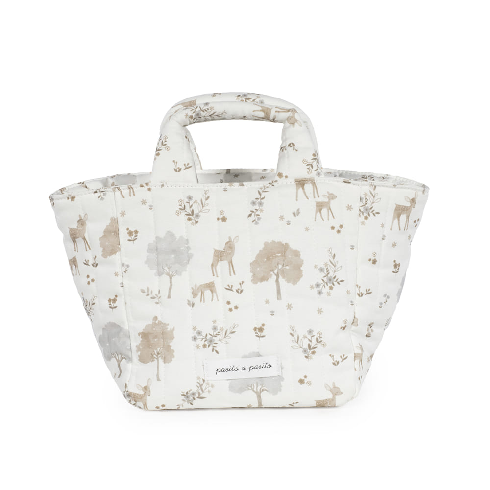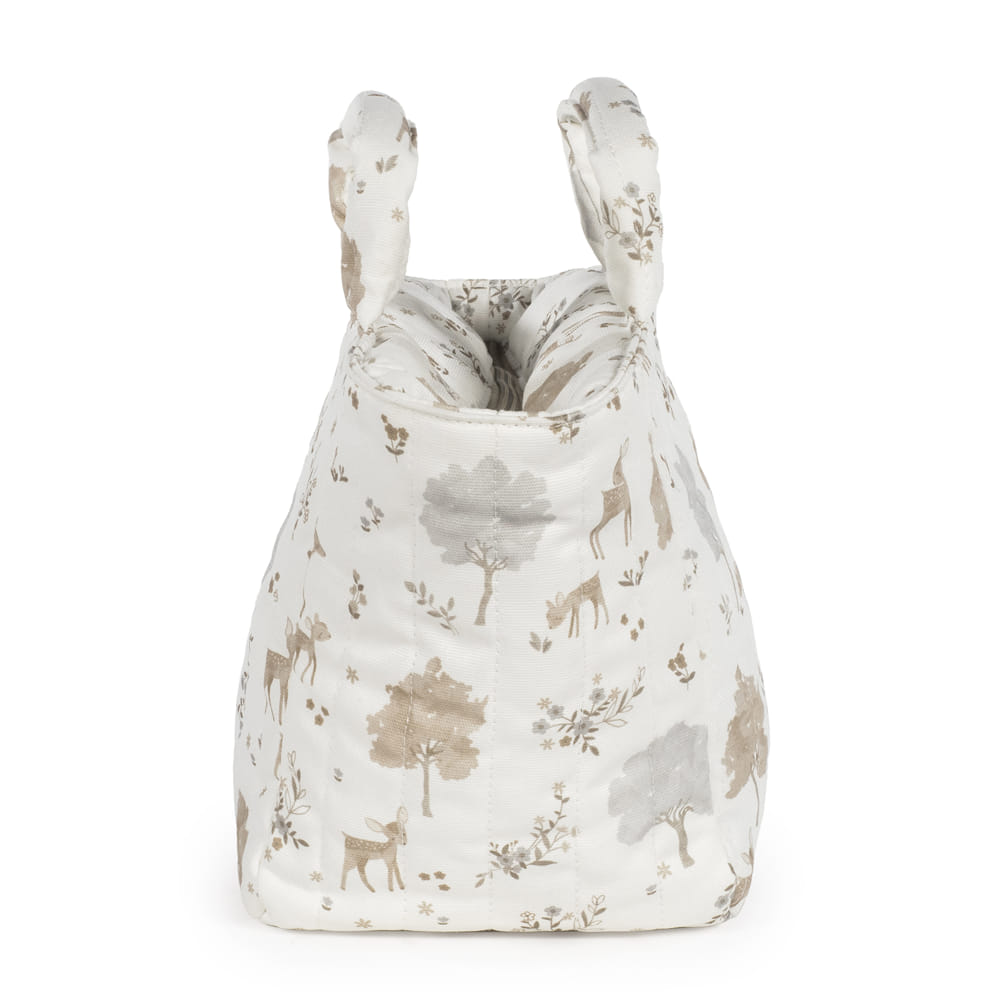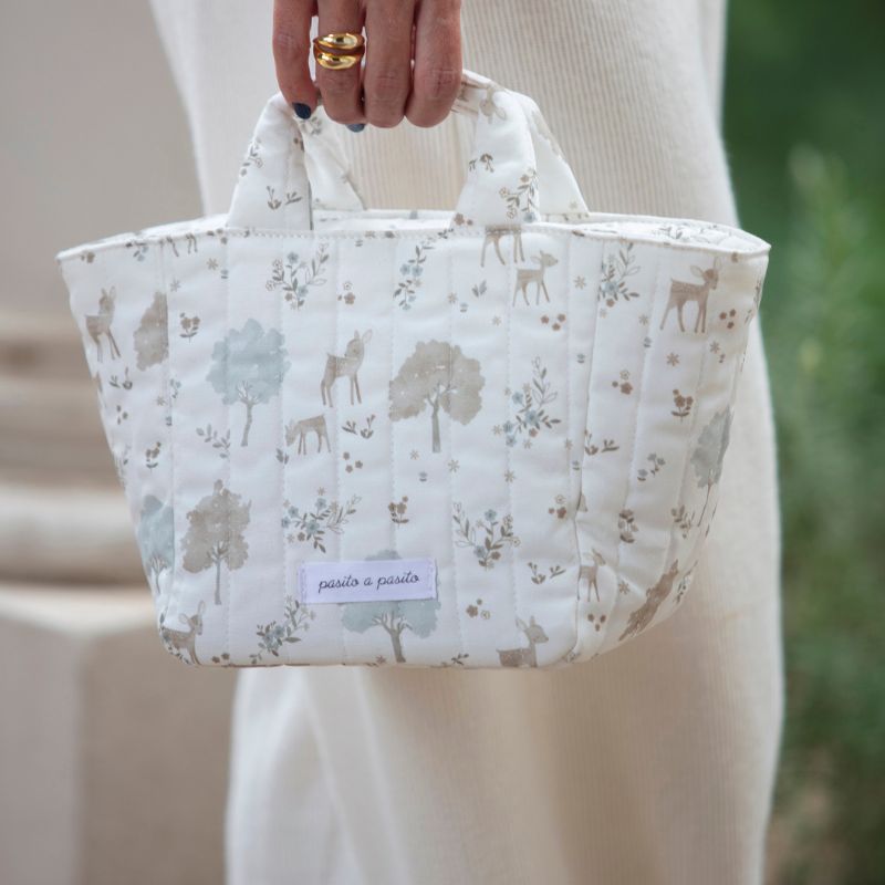 Confeccionado en loneta de algodón 100% y decorado con un delicado estampado de ciervos y árboles en tonos neutros, ofrece un espacio compacto pero preciso para organizar peines, lociones y pequeños objetos de higiene que suelen perderse dentro del bolso principal.
