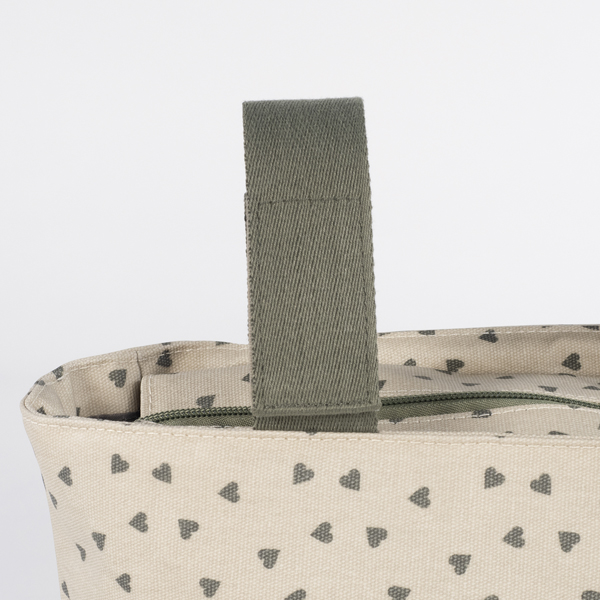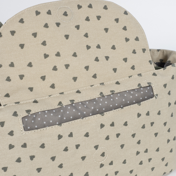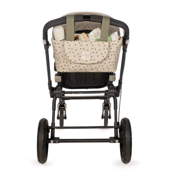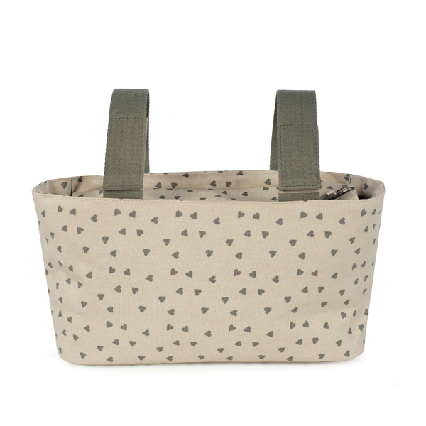Bolso organizador en color beige y corazones en color verde musgo. Ideal para tenerlo todo a mano en los paseos con tu bebé.