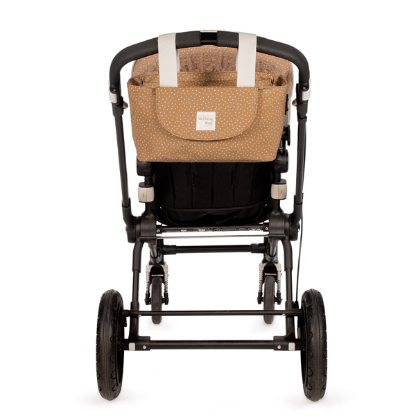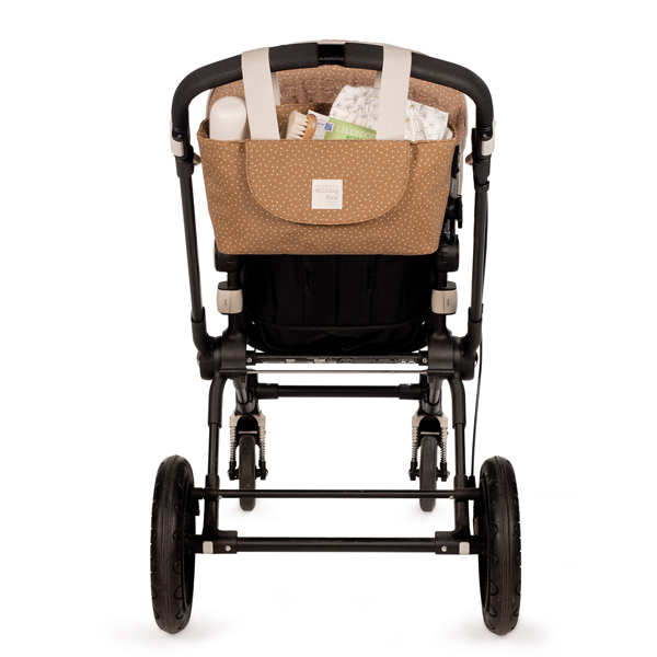 Bolso organizador en color canela y topitos en color beige. Ideal para tenerlo todo a mano en los paseos con tu bebé.
