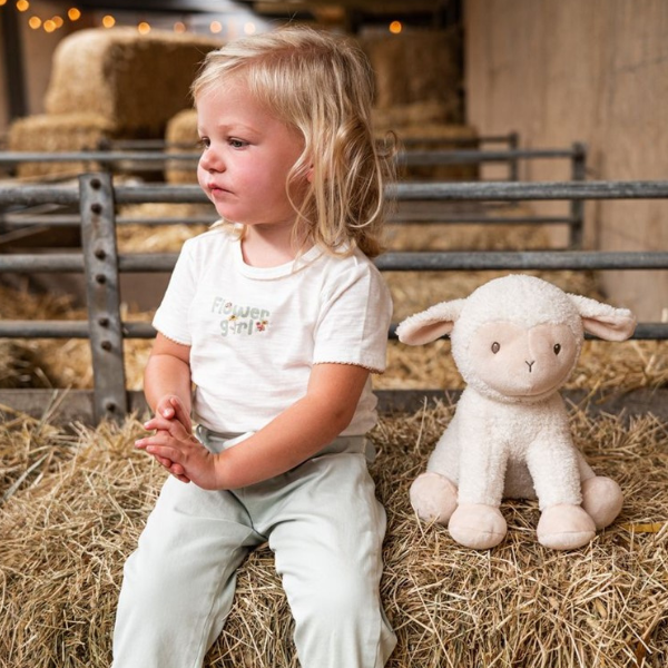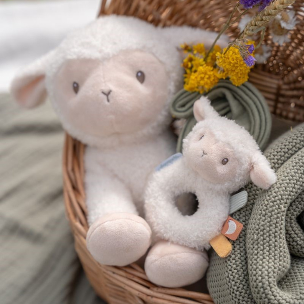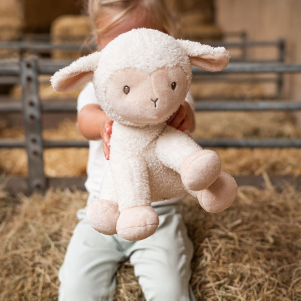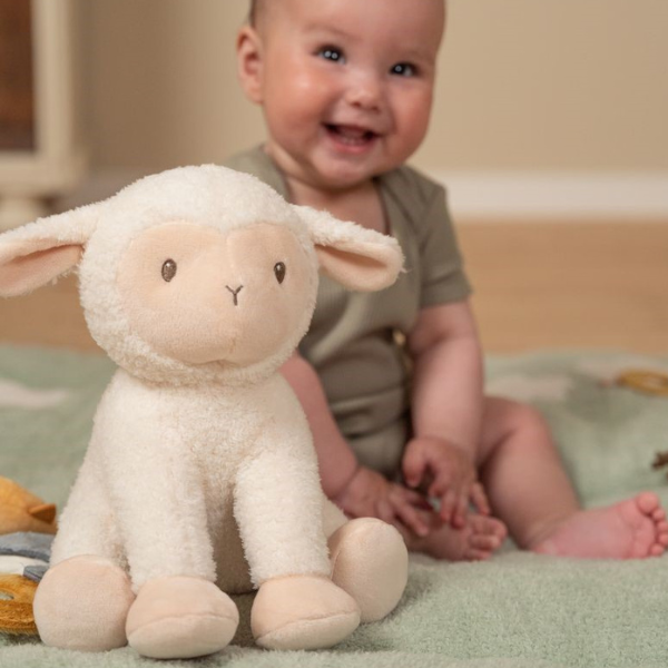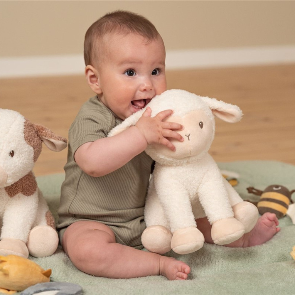 A tu peque le encantará la compañía de este adorable y suave peluche. Esta ovejita tiene grandes amigos con los que jugar, como son: la vaca, el cerdito y la gallina.