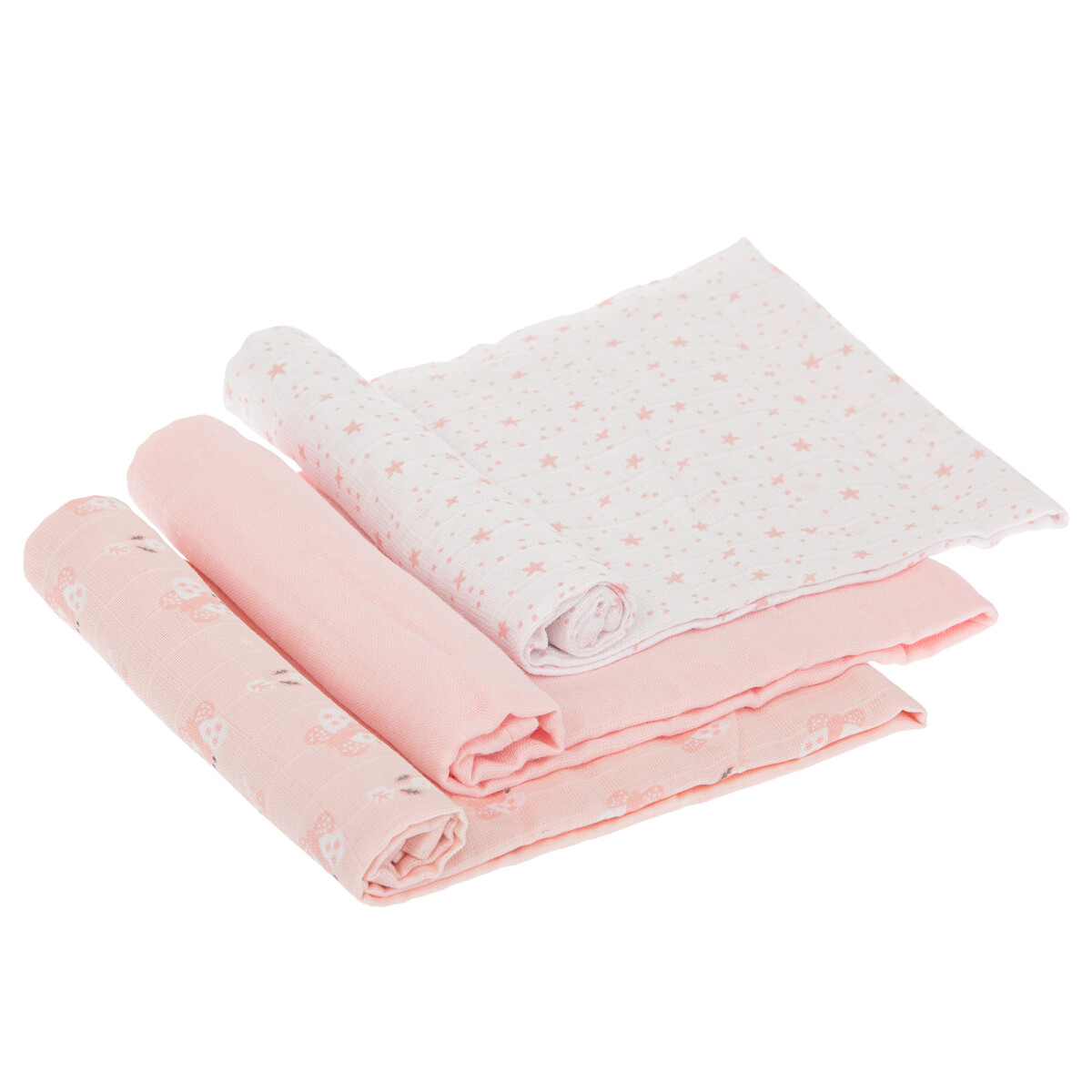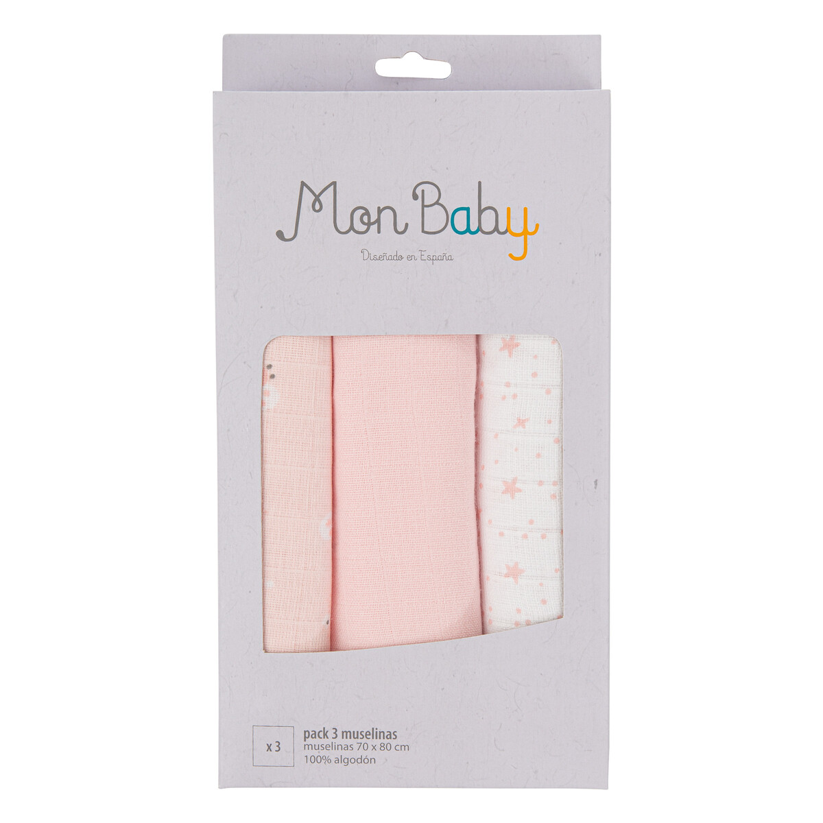 Este pack incluye 3 muselinas de 80×70 cm en color rosa con estampado de estrellas y mariposas.