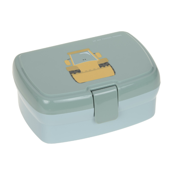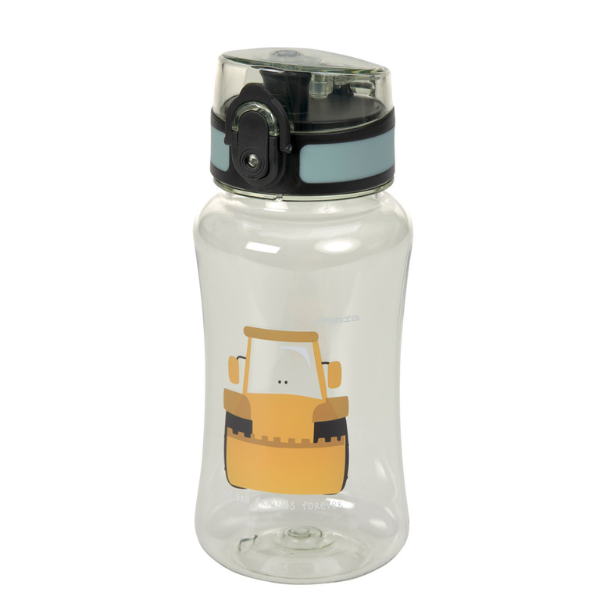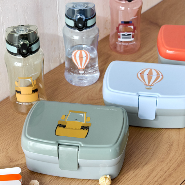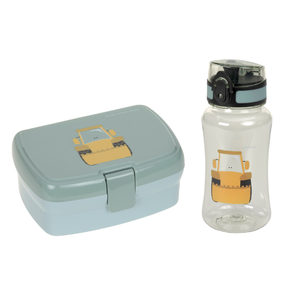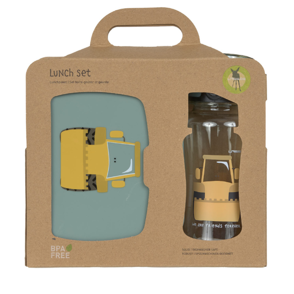 Pack de almuerzo con diseño de una excavadora. Incluye una cajita para llevar alimentos y una botella.