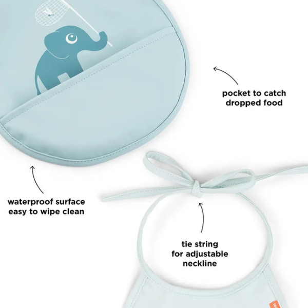 Babero con revestimiento impermeable lo cual permite que los peques no se manchen la ropa cuando comen solitos. Su cierre mediante cordón, es ajustable para adaptarse al tamaño del peque. Además, incorpora un bolsillo para recoger la posible comida que pueda caer.