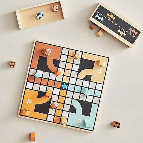 Tienes 16 coches pequeños en cuatro colores diferentes y 2 dados de madera que coinciden con los otros juguetes del concepto Aiden. Tira los dados y cruza los dedos para que te salga el número uno o el seis. Porque si es así, podrás conducir por uno de los caminos que conducen al emocionante campo de juego, donde puede pasar de todo. Si acabas en la misma casilla en la que ya está el coche de otra persona, volverás a empujar a ese jugador a su aparcamiento.