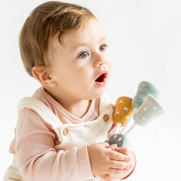 Sonajero en forma de campana, ideal para entretener a tu bebé. Favorece el desarrollo de la coordinación y del sentido del ritmo.