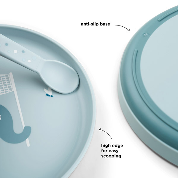 Plato en color azul con un divertido estampado de Elphee cazando luciérnagas. La altura del borde ayuda a recoger la comida fácilmente, mientras que la base del plato es antideslizante asegurando que el plato no se mueva de la mesa o trona.