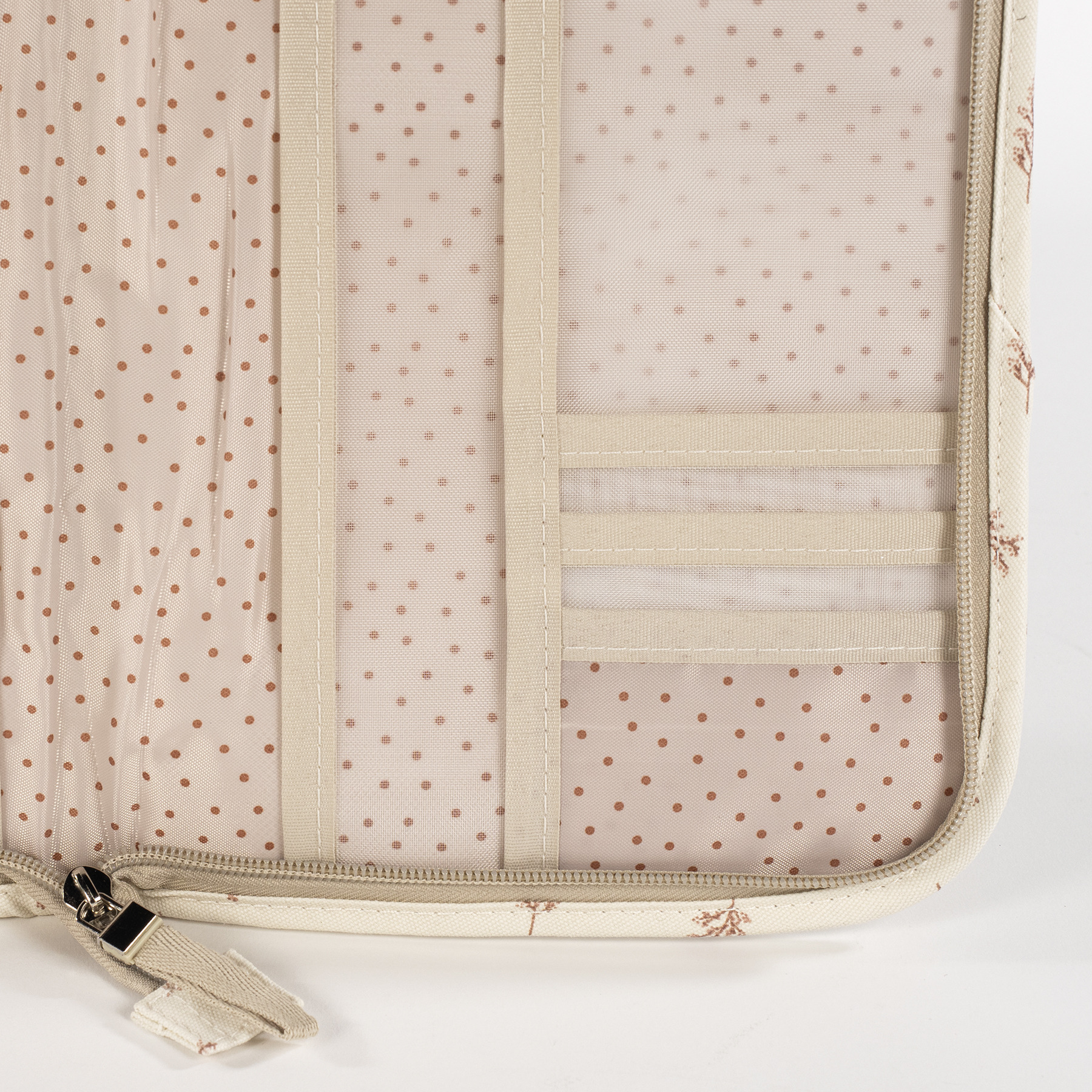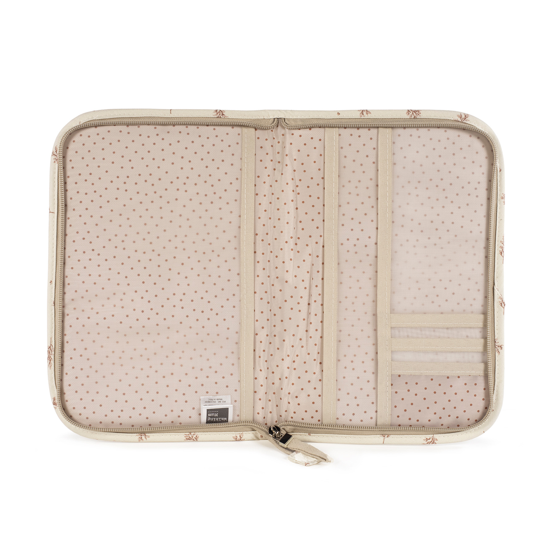 Esta funda porta documentos está elaborada en tela estampada, cuenta con múltiples bolsillos distribuidos en ambos lado para organizar mejor todo. También tiene un práctico cierre de cremallera para guardar seguro el libro de Nacimiento y todos los documentos de tu bebé.
