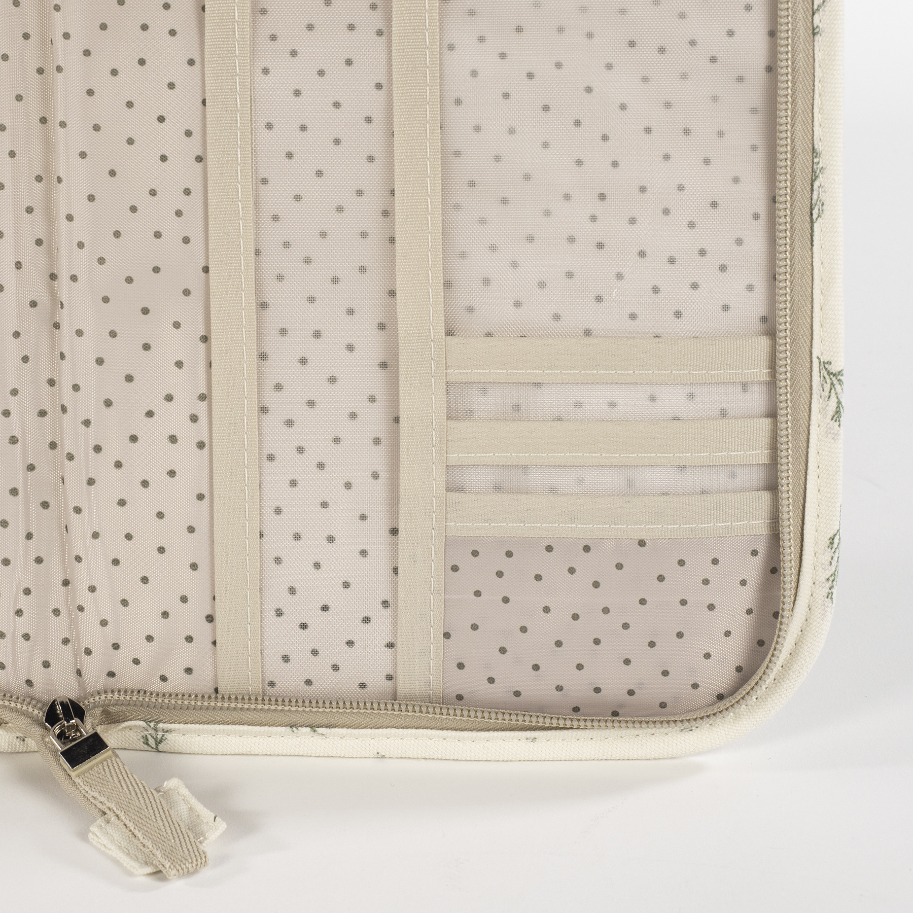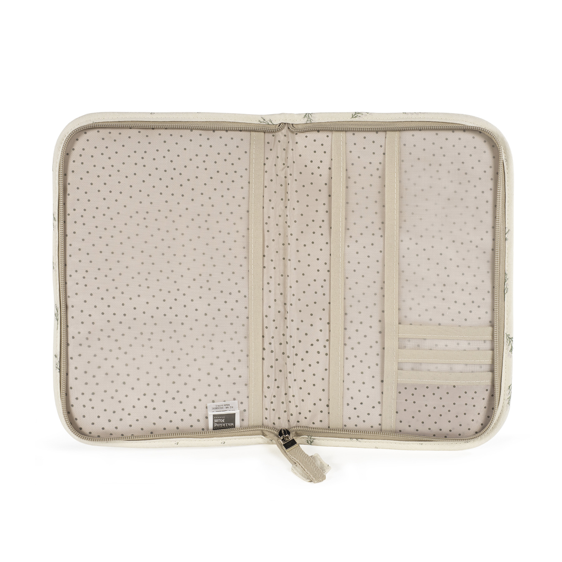 Esta funda porta documentos está elaborada en tela estampada, cuenta con múltiples bolsillos distribuidos en ambos lado para organizar mejor todo. También tiene un práctico cierre de cremallera para guardar seguro el libro de Nacimiento y todos los documentos de tu bebé.