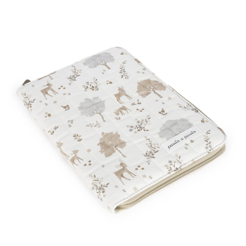 El portadocumentos Nara de Pasito a Pasito es un moderno y bonito libro de nacimiento elaborado en loneta de algodón 100% con un delicado estampado de ciervos y árboles en tonos neutros.