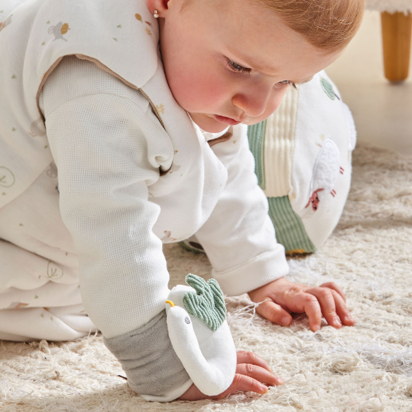 Suave sonajero para atar alrededor de la muñeca de tu bebé. Cuando agite sus manos sonará y empezará la diversión.