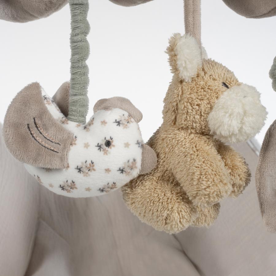 Actividades interactivas: Incluye colgantes con diferentes texturas, formas y sonidos que fomentan la exploración sensorial y el desarrollo motor.