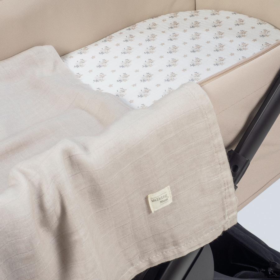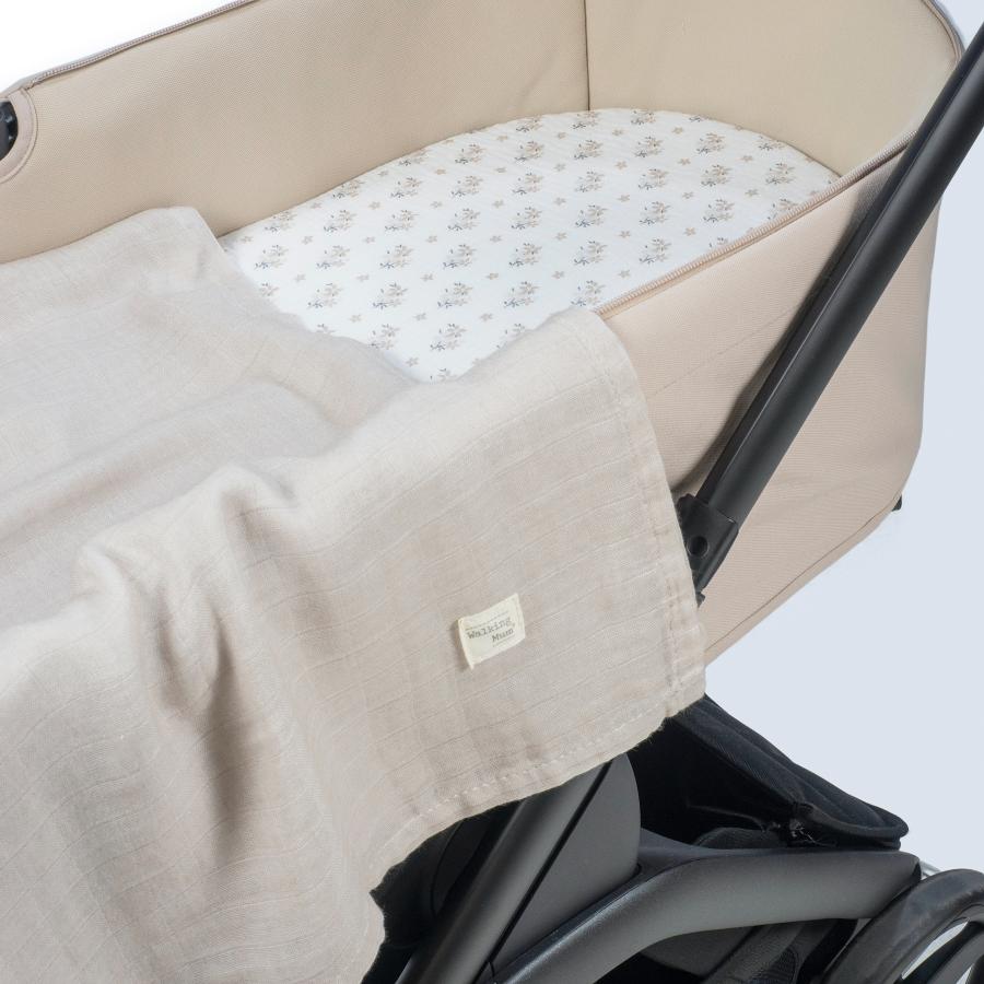 Sábana bajera ajustable: Fabricada en muselina 100% algodón, ofrece suavidad y transpirabilidad excepcionales, perfecta para moisés o capazos.