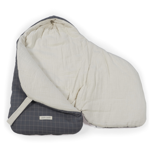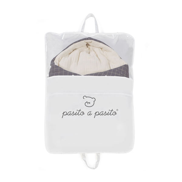 Saco arrullo con capucha confeccionado en tejido estampado de cuadros y bambula muy suave. Te resultará muy útil y versátil para los primeros días de tu bebé. Es un saco acolchado y acogedor que permitirá que el descanso sea más agradable.