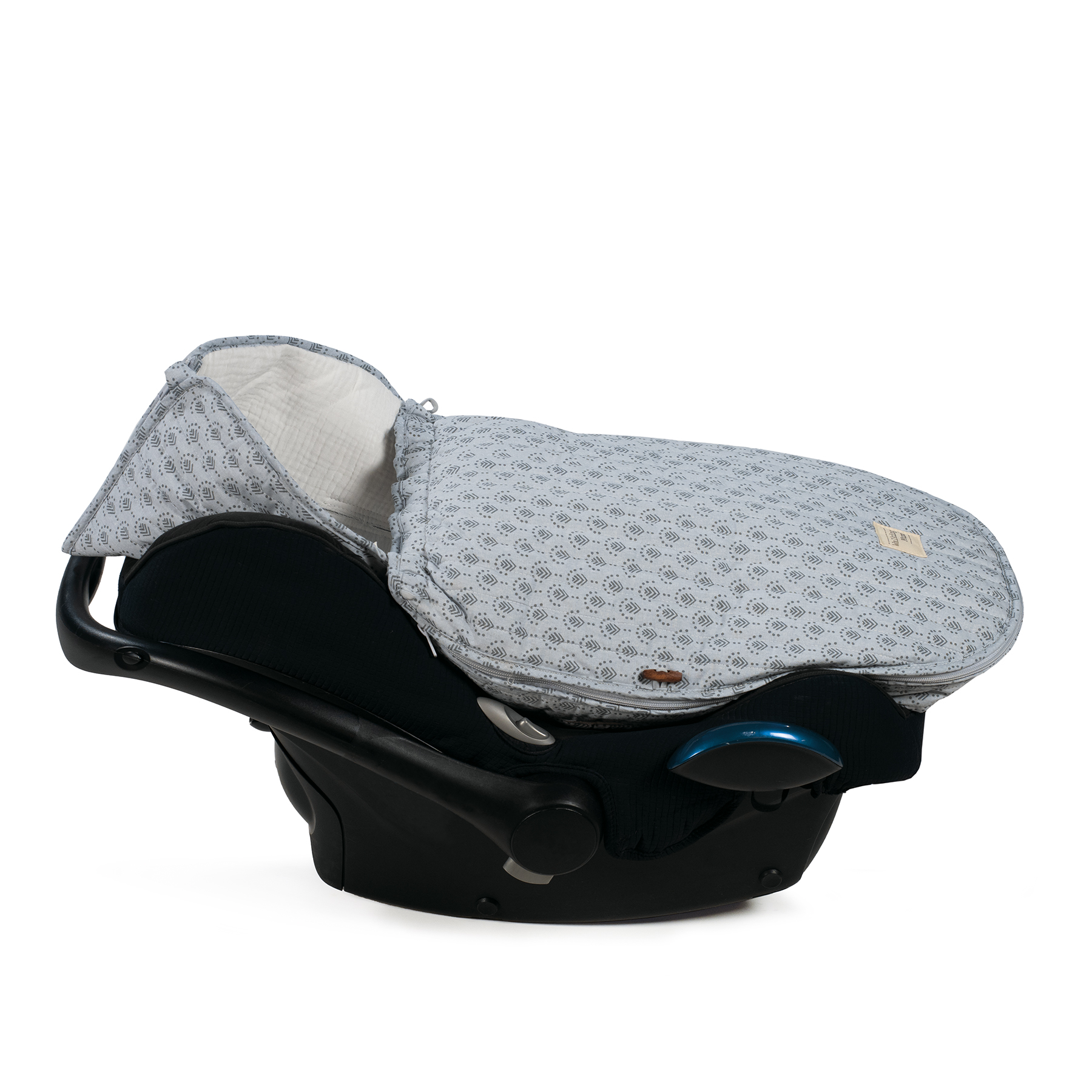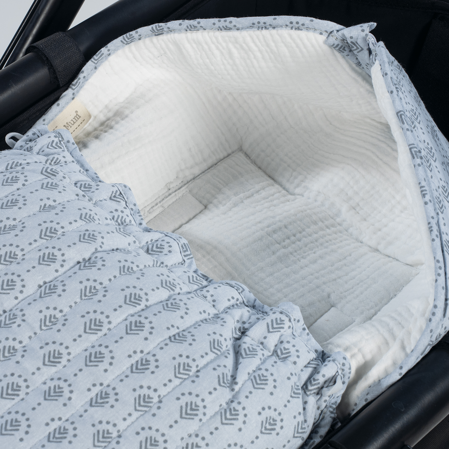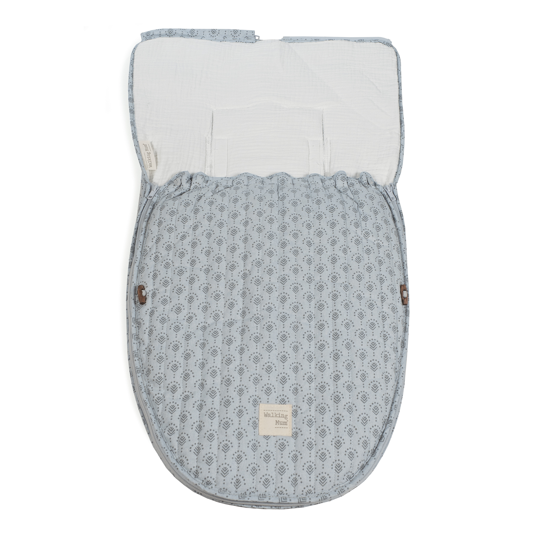 Funda con saco en color gris-azul con estampado geométrico. Se adapta mediante unas aperturas (ojales) y ajustes a la mayoría de cucos y portabebés del mercado. Es ideal para los meses de primavera y de otoño. Cuenta con un material que evita la sudoración excesiva del bebé, protegiendo también la silla. Podrás sacar a tu bebé del carro a la cuna sin incomodarlo.