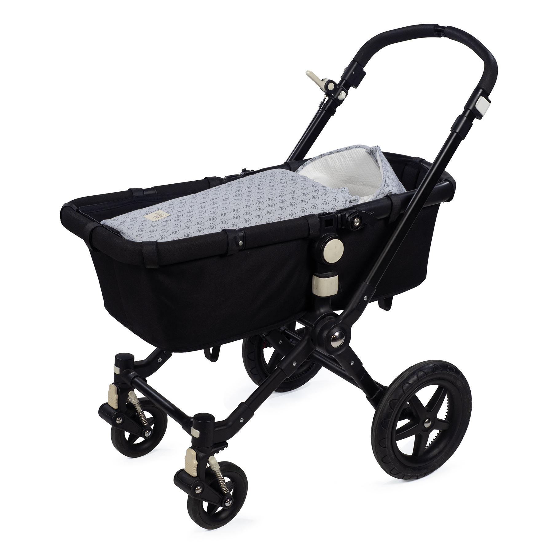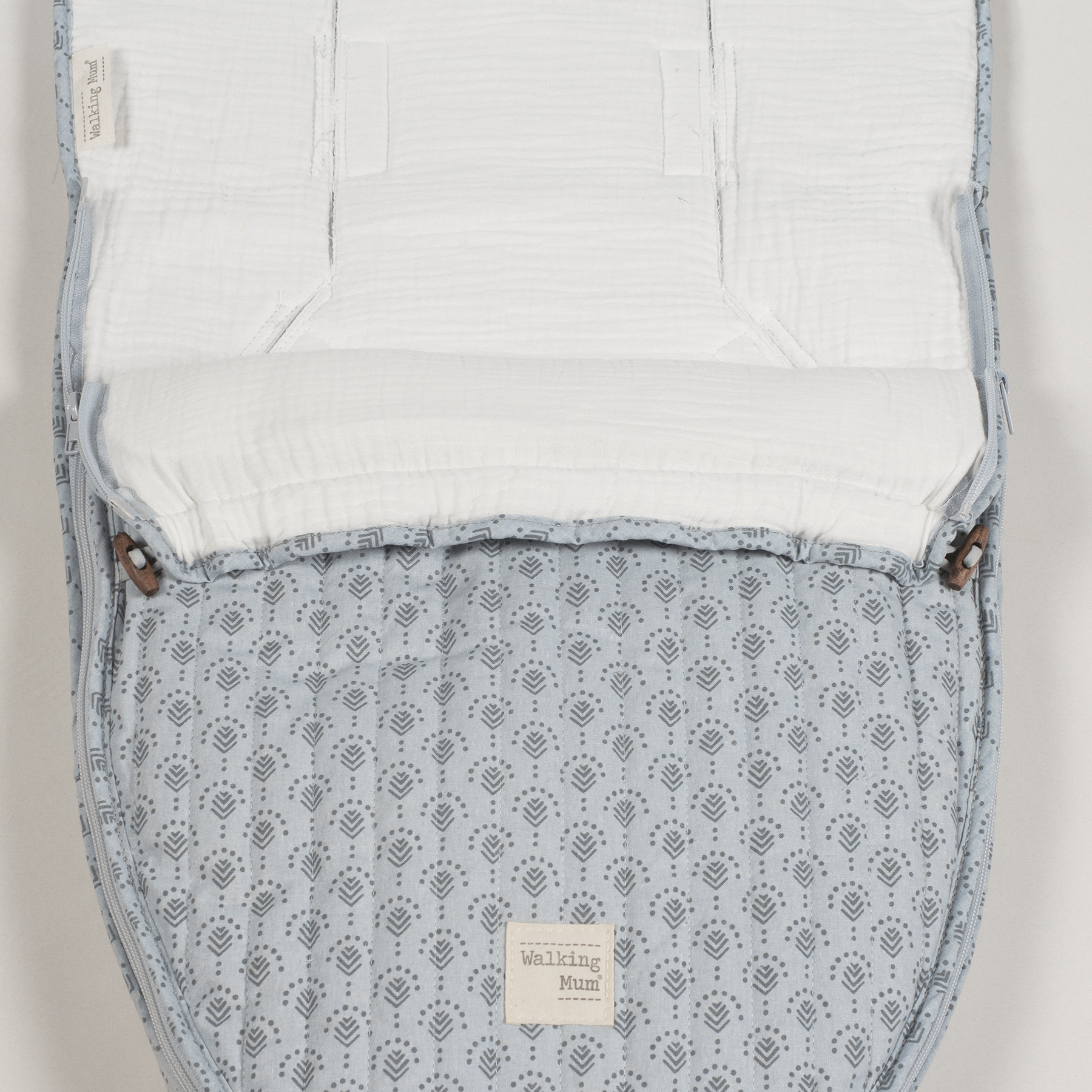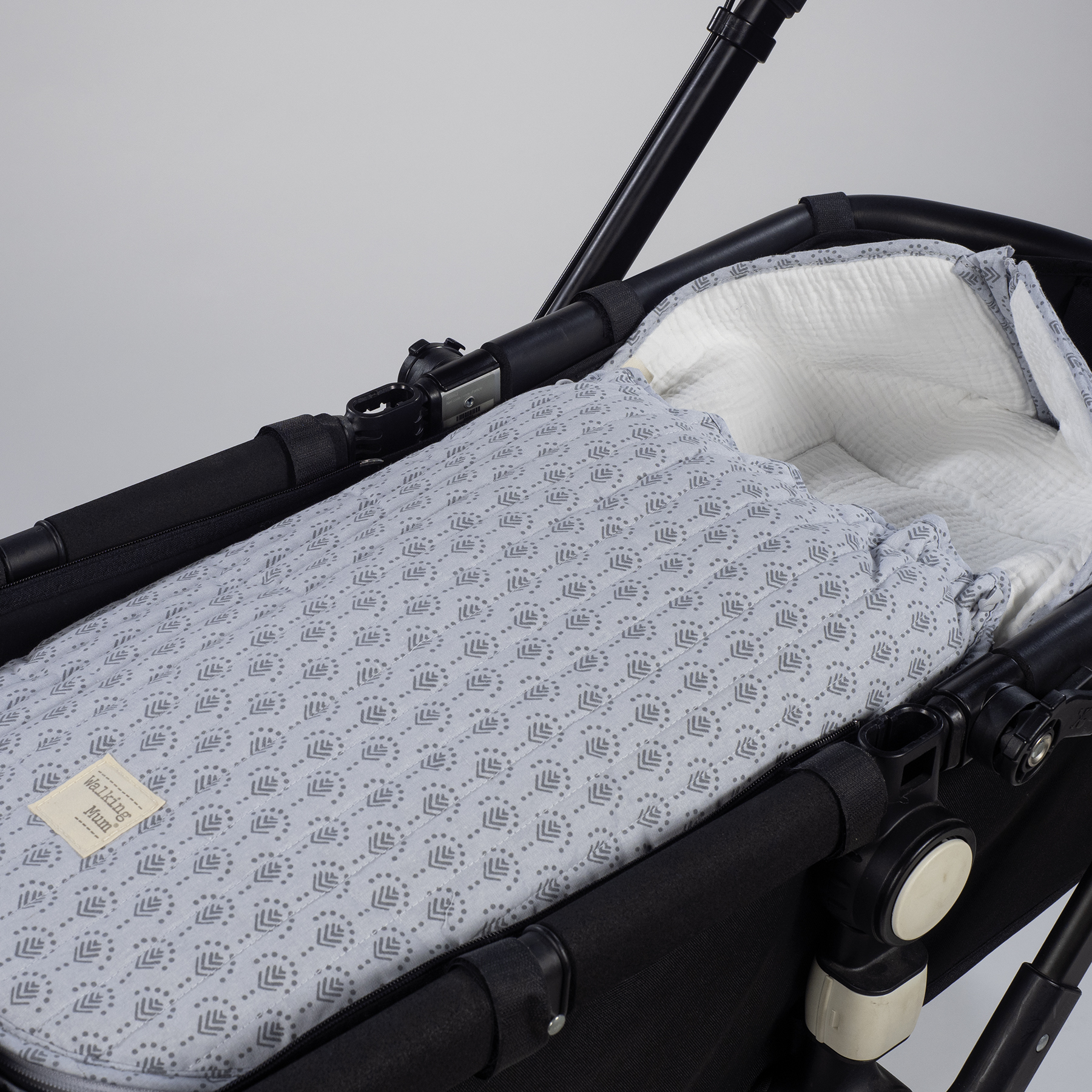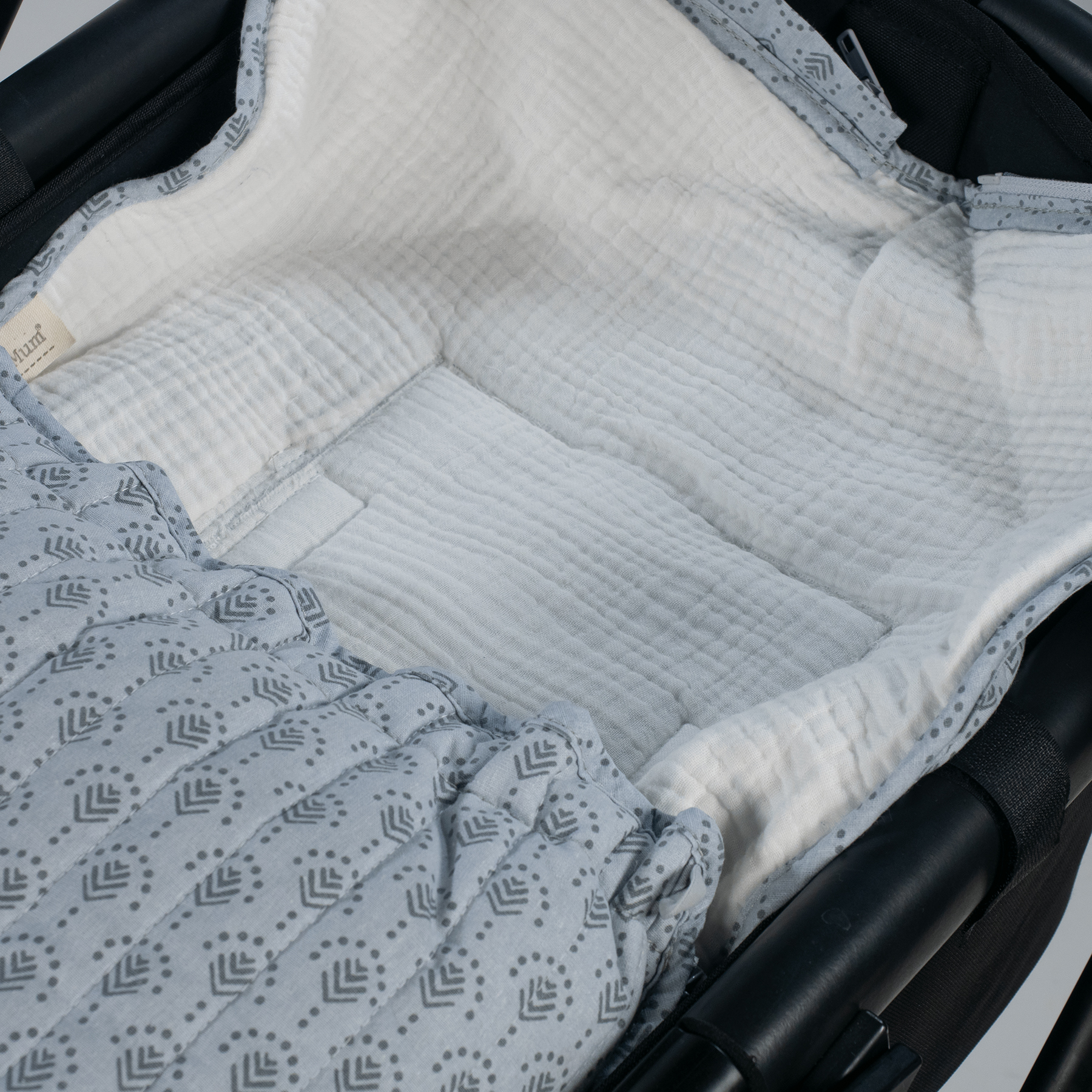 Funda con saco en color gris-azul con estampado geométrico. Se adapta mediante unas aperturas (ojales) y ajustes a la mayoría de cucos y portabebés del mercado. Es ideal para los meses de primavera y de otoño. Cuenta con un material que evita la sudoración excesiva del bebé, protegiendo también la silla. Podrás sacar a tu bebé del carro a la cuna sin incomodarlo.