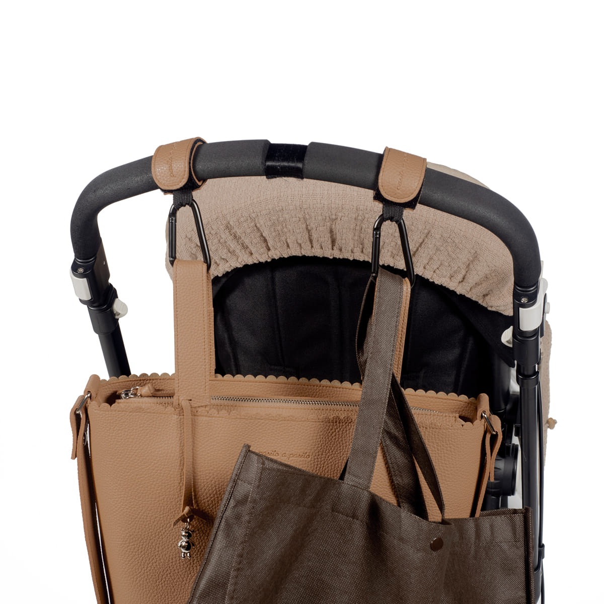 Set de 2 ganchos de metal. Es muy fácil de colocar, gracias a sus tiras con velcro. Perfectos para colgar la bolsa canastilla o cuaquier bolso que necesites llevar en el cochecito.