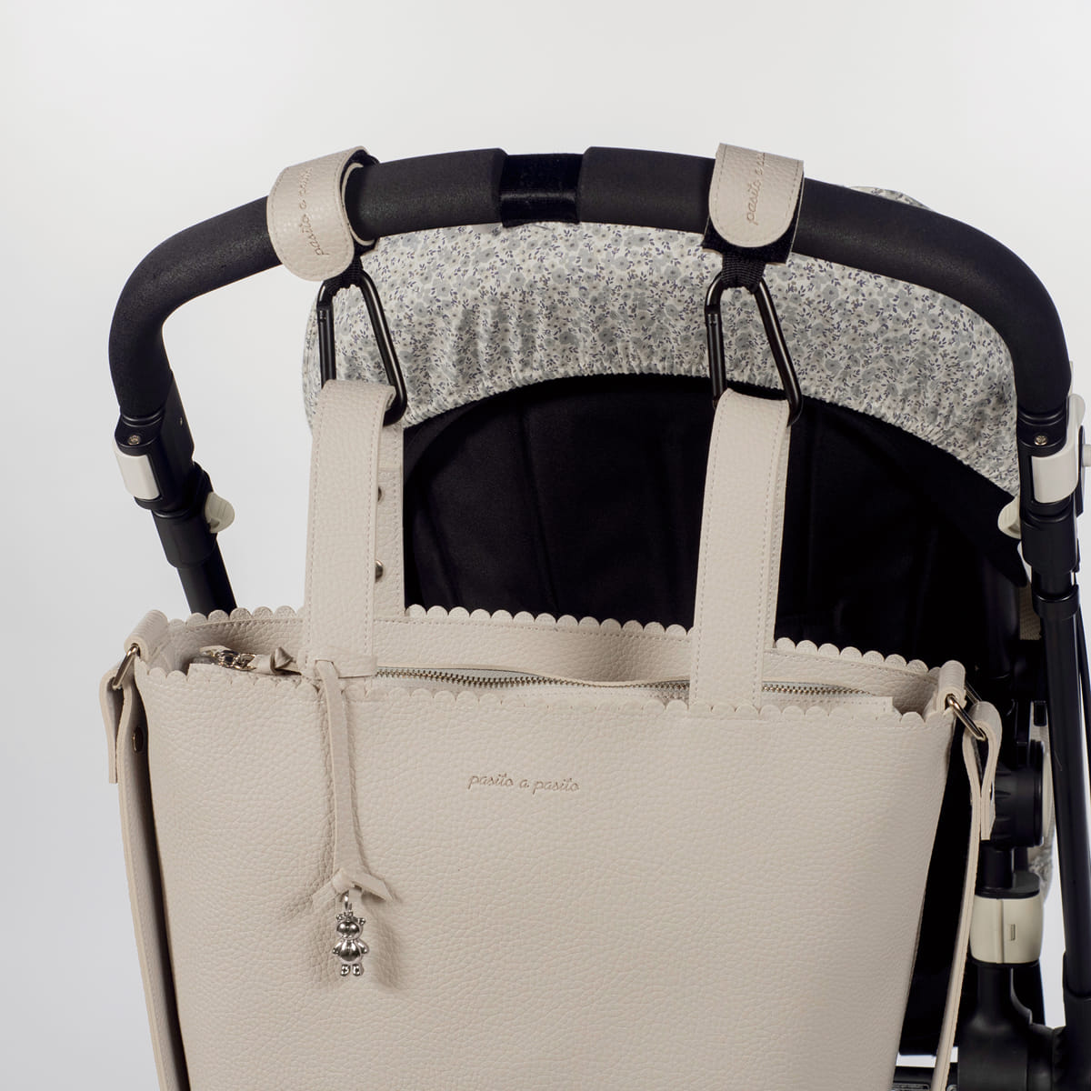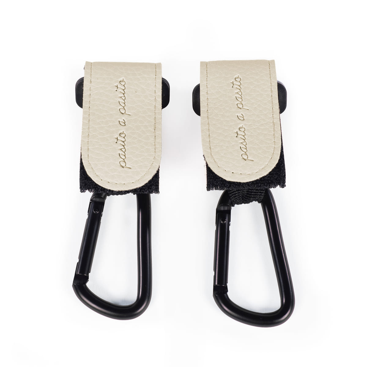 Set de 2 ganchos de metal. Es muy fácil de colocar, gracias a sus tiras con velcro. Perfectos para colgar la bolsa canastilla o cuaquier bolso que necesites llevar en el cochecito.