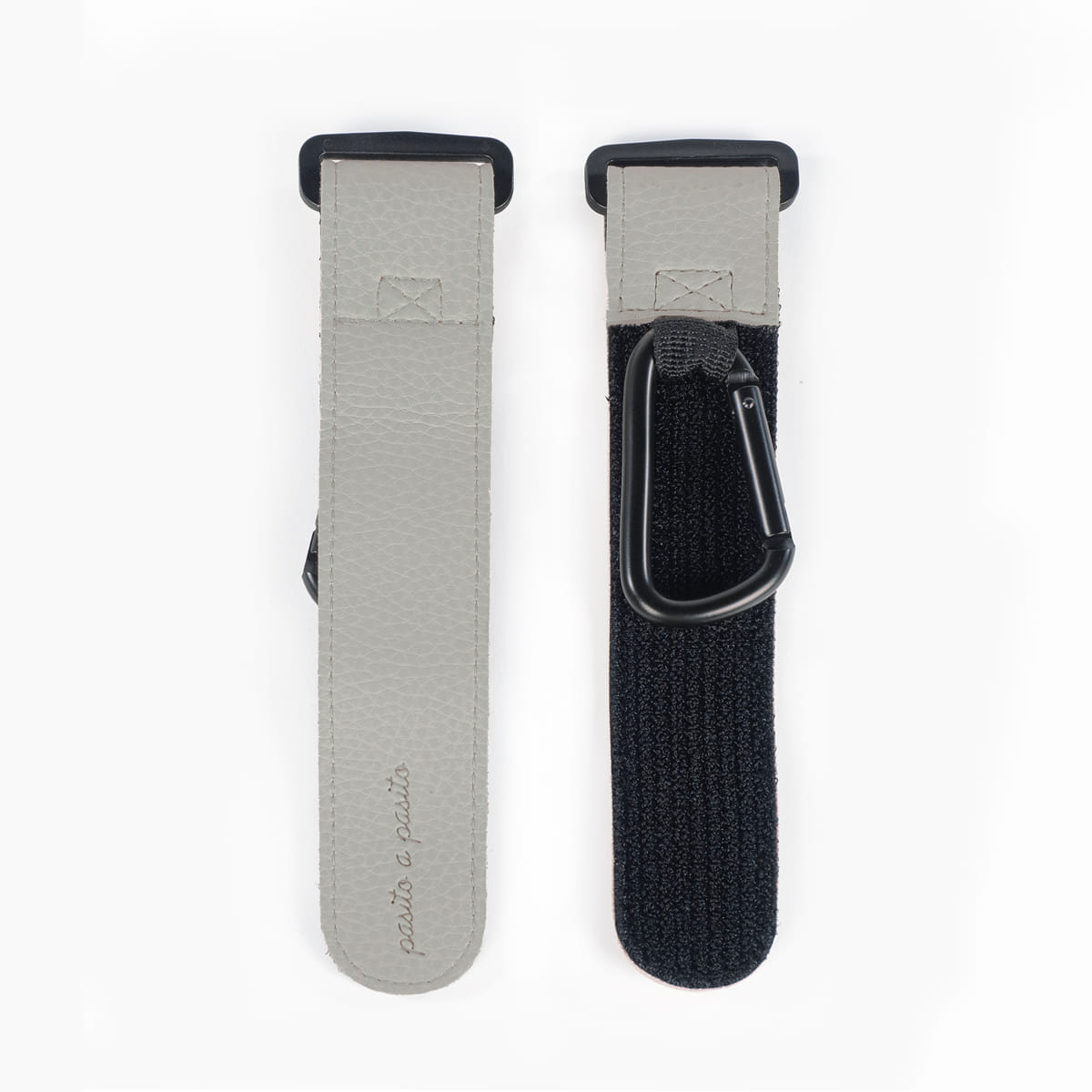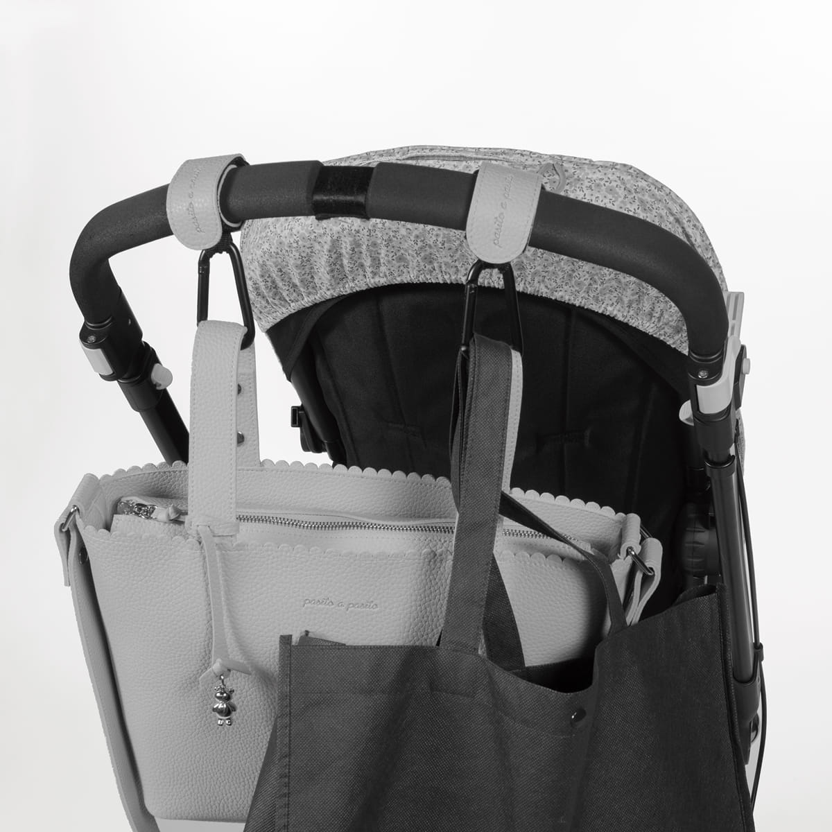 Set de 2 ganchos de metal. Es muy fácil de colocar, gracias a sus tiras con velcro. Perfectos para colgar la bolsa canastilla o cuaquier bolso que necesites llevar en el cochecito.