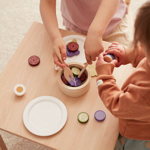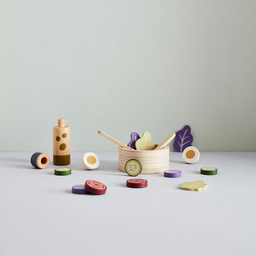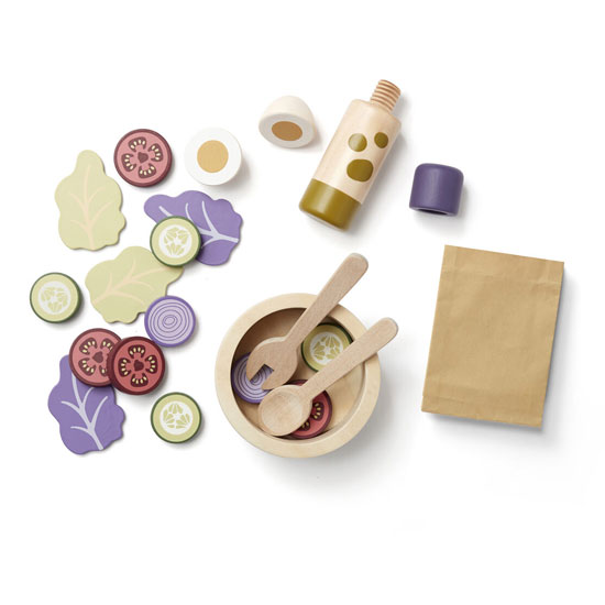 - Material: Cuenco: contrachapado de tilo. Servidores de ensalada, botella de aceite, medio huevo: Schima. Verduras: MDF. Bolsa: Papel.