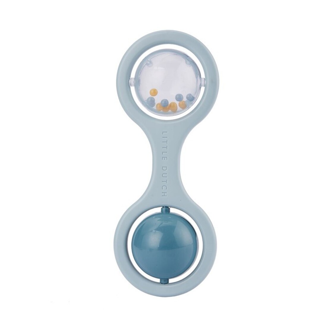 Sonajero en color azul, diseñado para que tu bebé pueda sostenerlo fácilmente. Podrá agitarlo y escuchar las bolitas moverse, además de hacer girar la pelota giratoria.