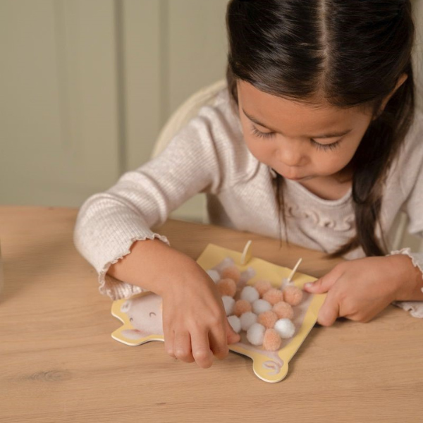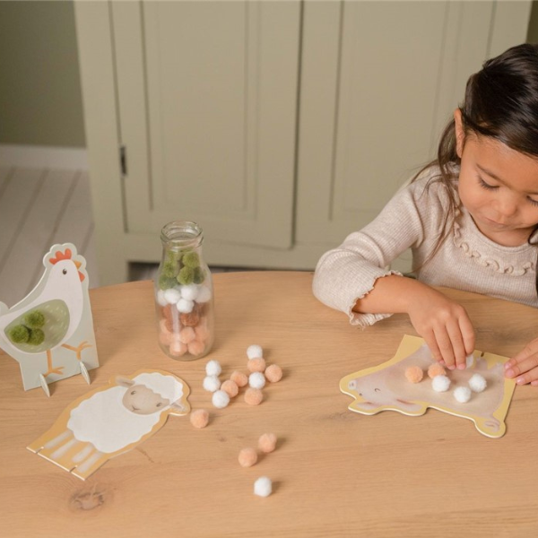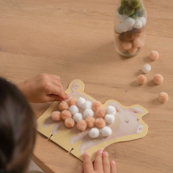 Juego que incluye 4 tarjetas distintas (vaca, cerdo, oveja y gallina) y 4 colores diferentes de pompones para decorar los cartones. Los cartones tienen una capa autoadhesiva. También se incluye un soporte para que las tarjetas decoradas se mantengan de pie.