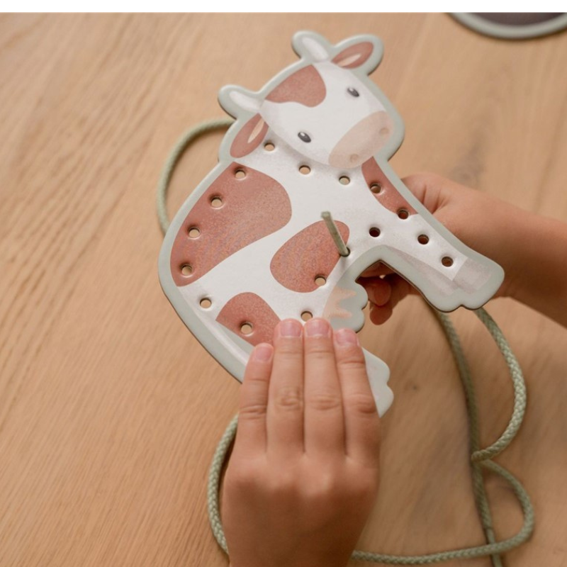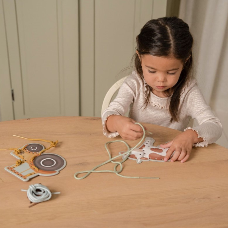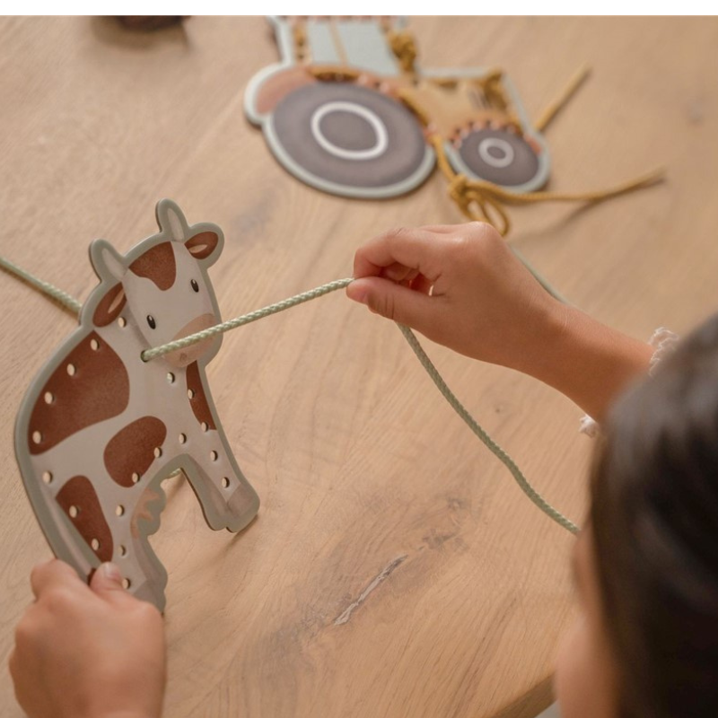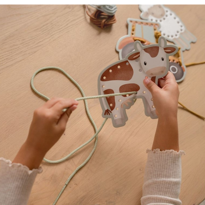 Este kit contiene 5 tarjetas grandes y resistentes con ilustraciones de animales como vacas, gallinas y ovejas, así como un tractor y una granja, todos de la colección Little Farm. Son ideales para fomentar el desarrollo de las habilidades motoras finas. Además, viene con cuatro cordones de colores variados para que puedas enlazar las tarjetas de manera creativa.