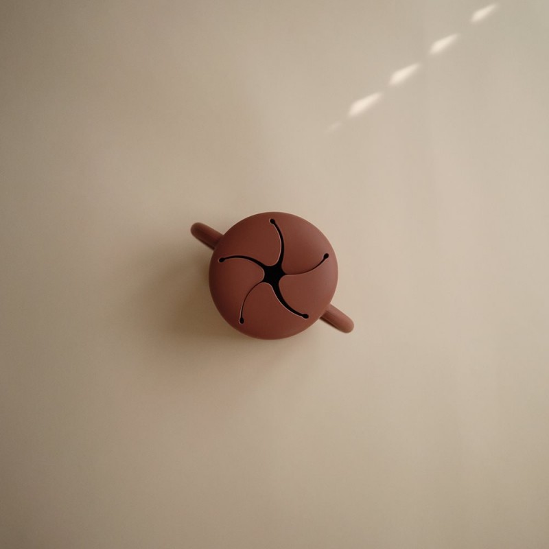 El vaso para snacks es a prueba de derrames y está diseñada con cómodas asas en los costados para que el niño pueda agarrarla bien.