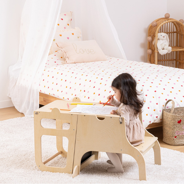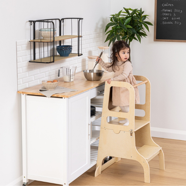 Torre de observación de Atmosphera Home. Brinda diversión y rutina diaria a tu peque, con esta torre 3 en 1, totalmente segura y certificada. Podrá escribir con la tiza en la pizarra o convertir el mueble en un escritorio con banco. En el modo torre, tu peque podrá explorar y observar lo que hay a su alrededor. Esta torre Montessori fomenta la curiosidad y el aprendizaje seguro, y se ajusta fácilmente entre sus funciones gracias a un seguro de metal. Además, es ligera y fácil de mover, incluso por el niño.