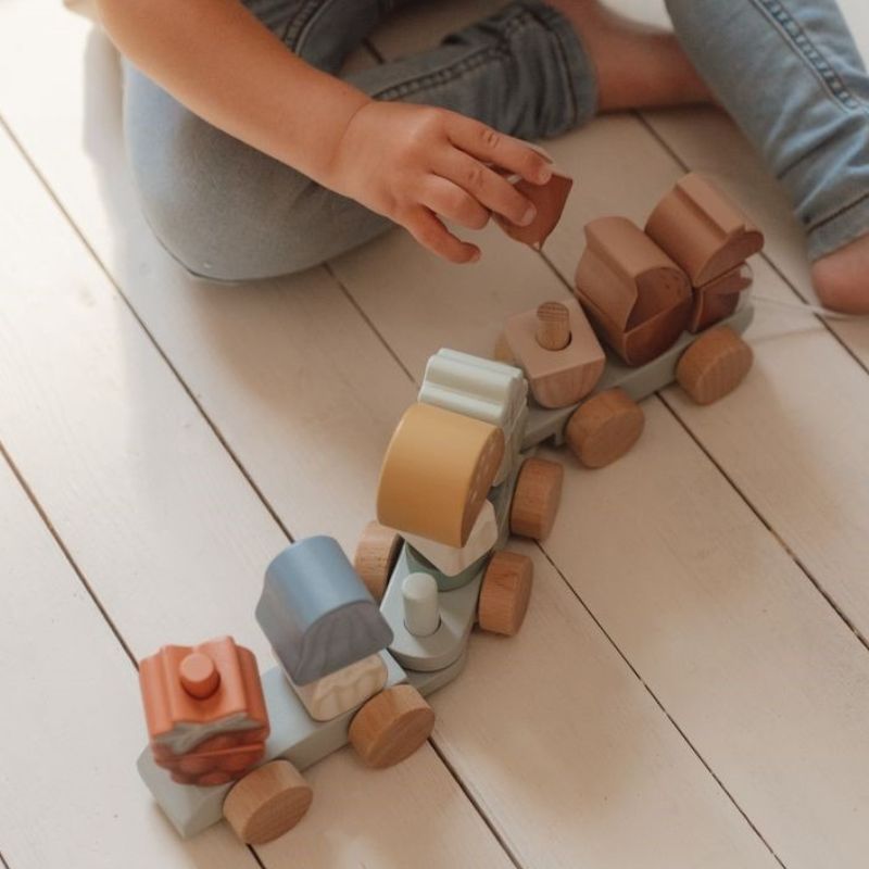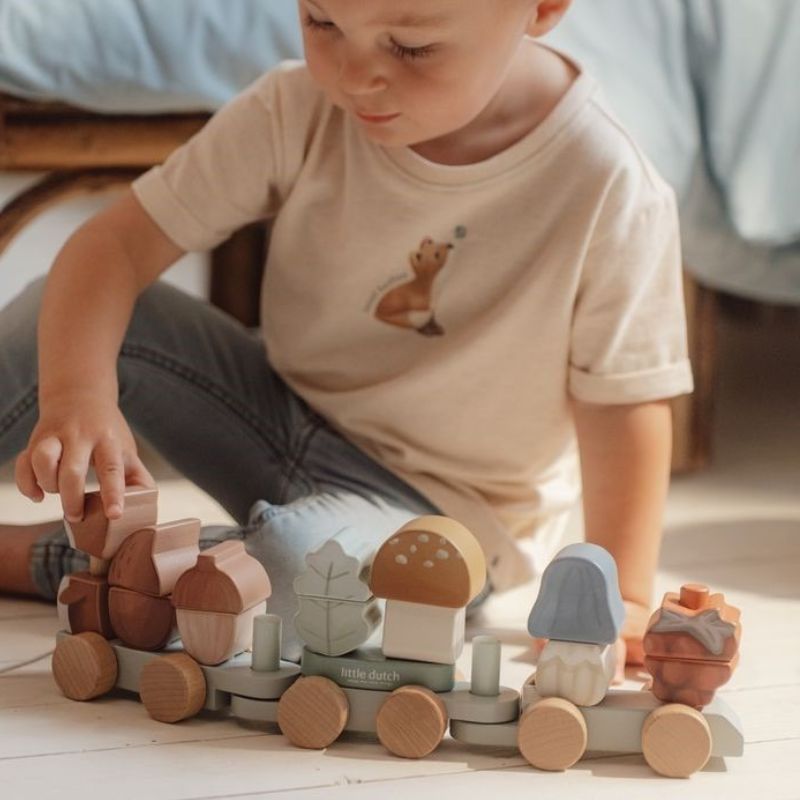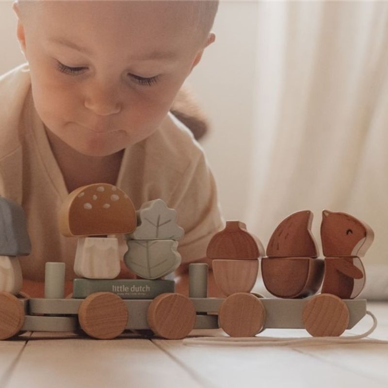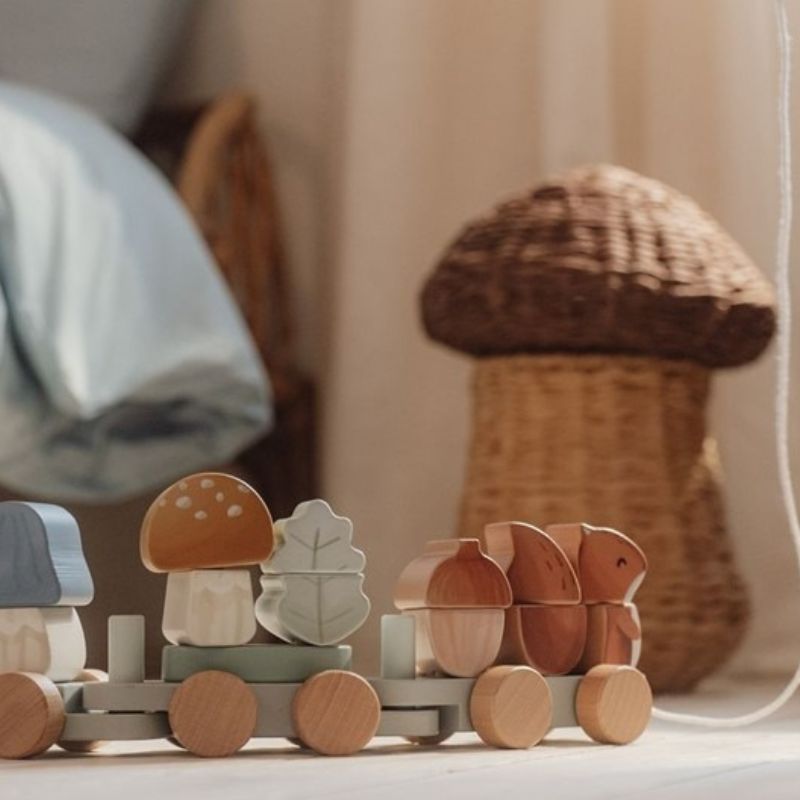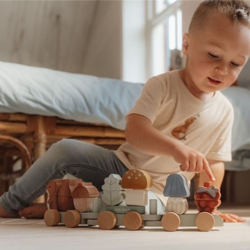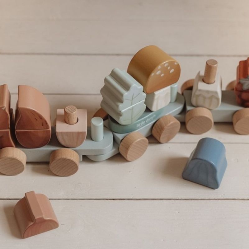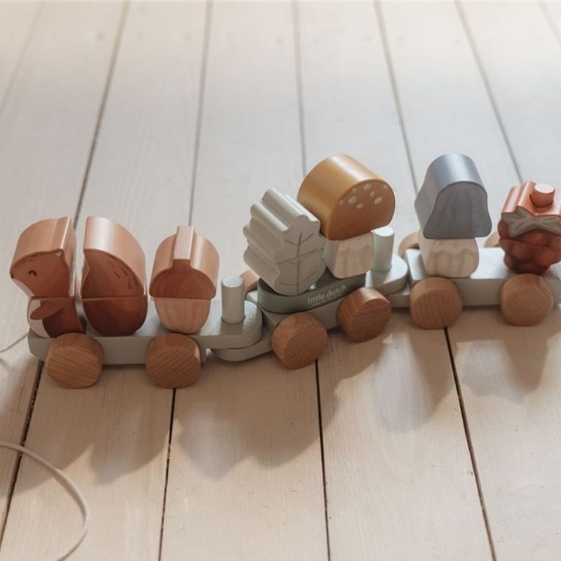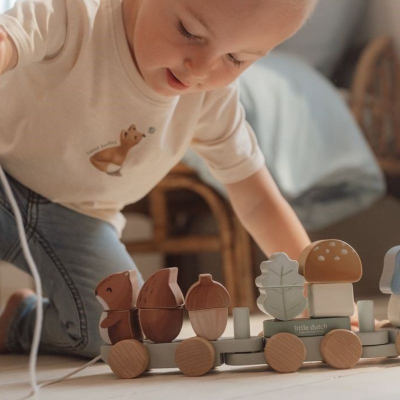 Tren apilable ilustrado con una ardilla y elementos del bosque. Este tren consta de 18 piezas con distintos colores y formas para que tu peque los apile como desee para crear distintas combinaciones.