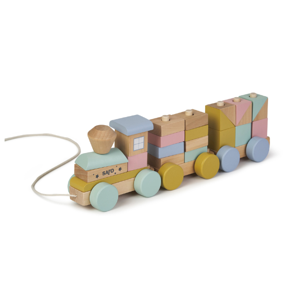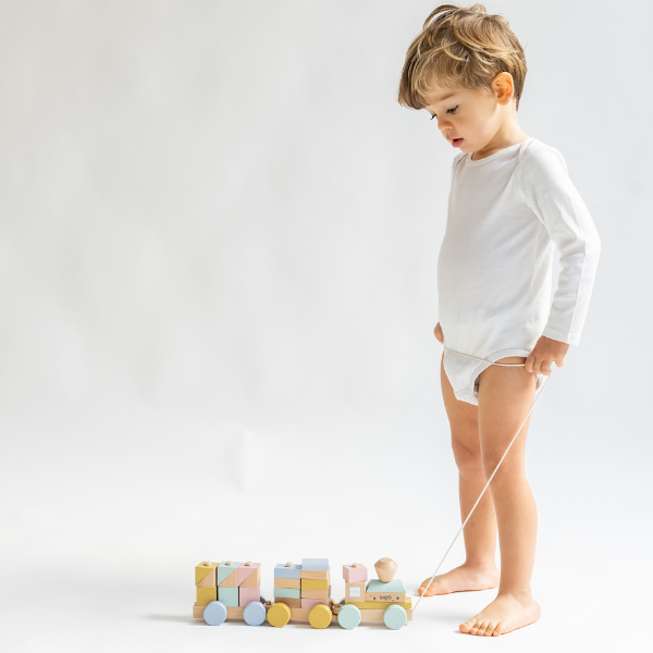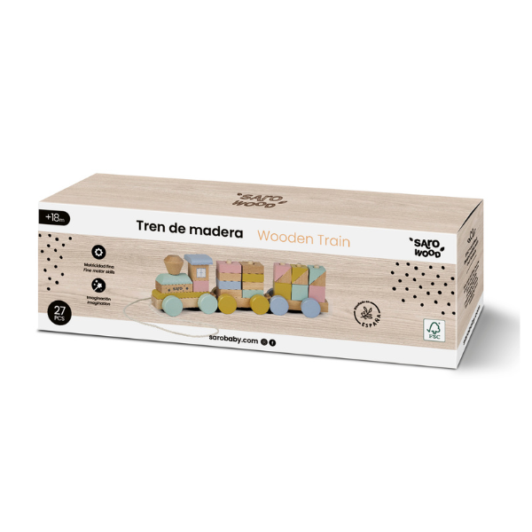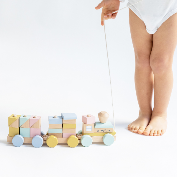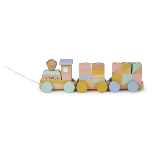 Tren de madera compuesto por tres vagones, repleto de piezas apilables en distintos colores y formas, que ayudarán a tu peque a desarrollar la imaginación, la coordinación mano-ojo y la motricidad fina. Además incluye una cuerda para poder llevarlo de un lado a otro.