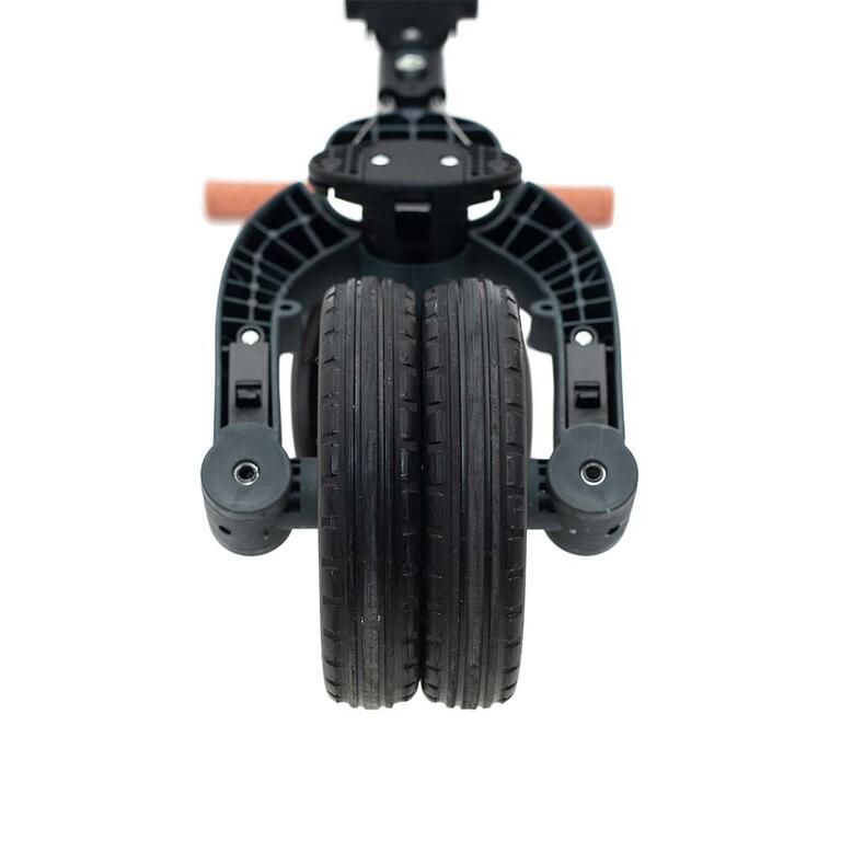- Con ruedas de goma muy resistentes, la bicicleta se adhiere perfectamente a la superficie, tanto en versión de tres como de dos ruedas.