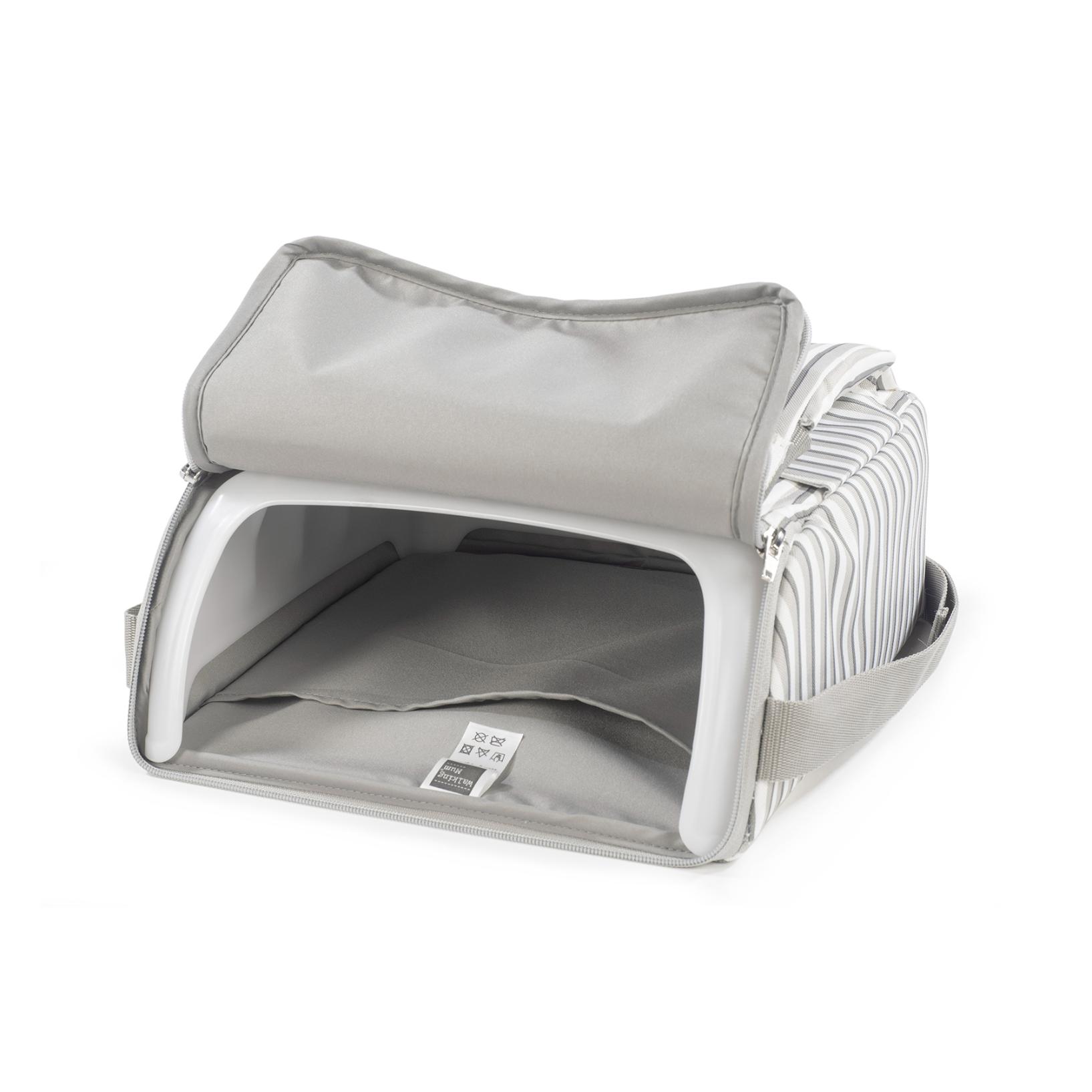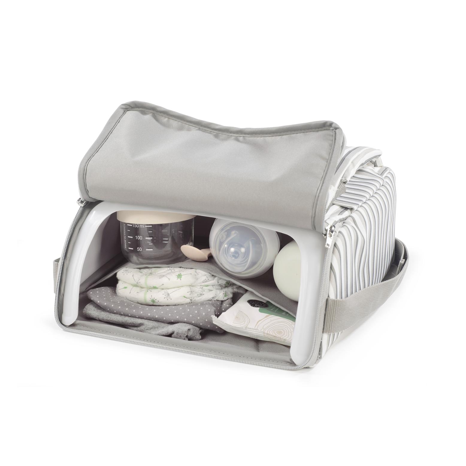 Cuenta con una correa para llevarla cómodamente al hombro. Incluye un compartimento de almacenamiento en la base, perfecto para guardar pañales, toallitas u otros accesorios esenciales del bebé. Se adapta a la mayoría de las sillas de adulto estándar, ofreciendo versatilidad y comodidad en diferentes entornos.