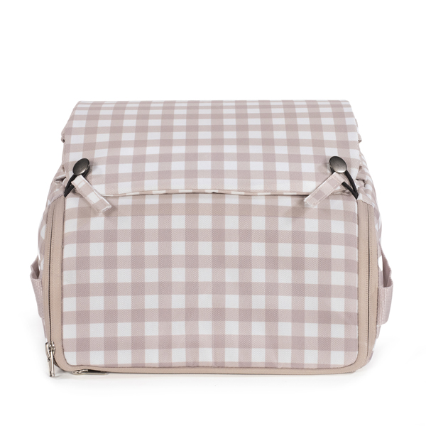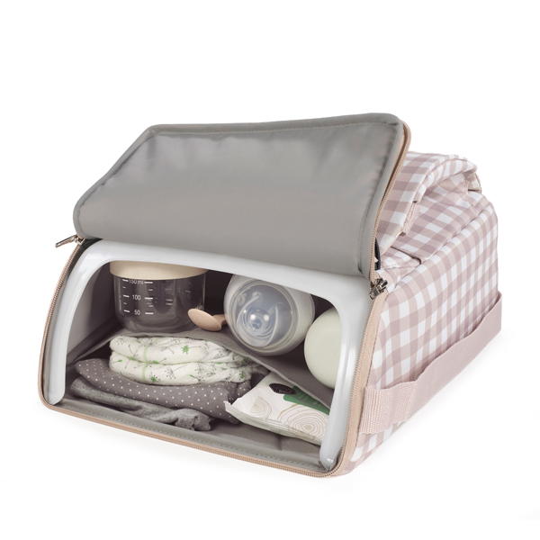 Cuenta con una correa para llevarla cómodamente al hombro. Incluye un compartimento de almacenamiento en la base, perfecto para guardar pañales, toallitas u otros accesorios esenciales del bebé. Se adapta a la mayoría de las sillas de adulto estándar, ofreciendo versatilidad y comodidad en diferentes entornos.